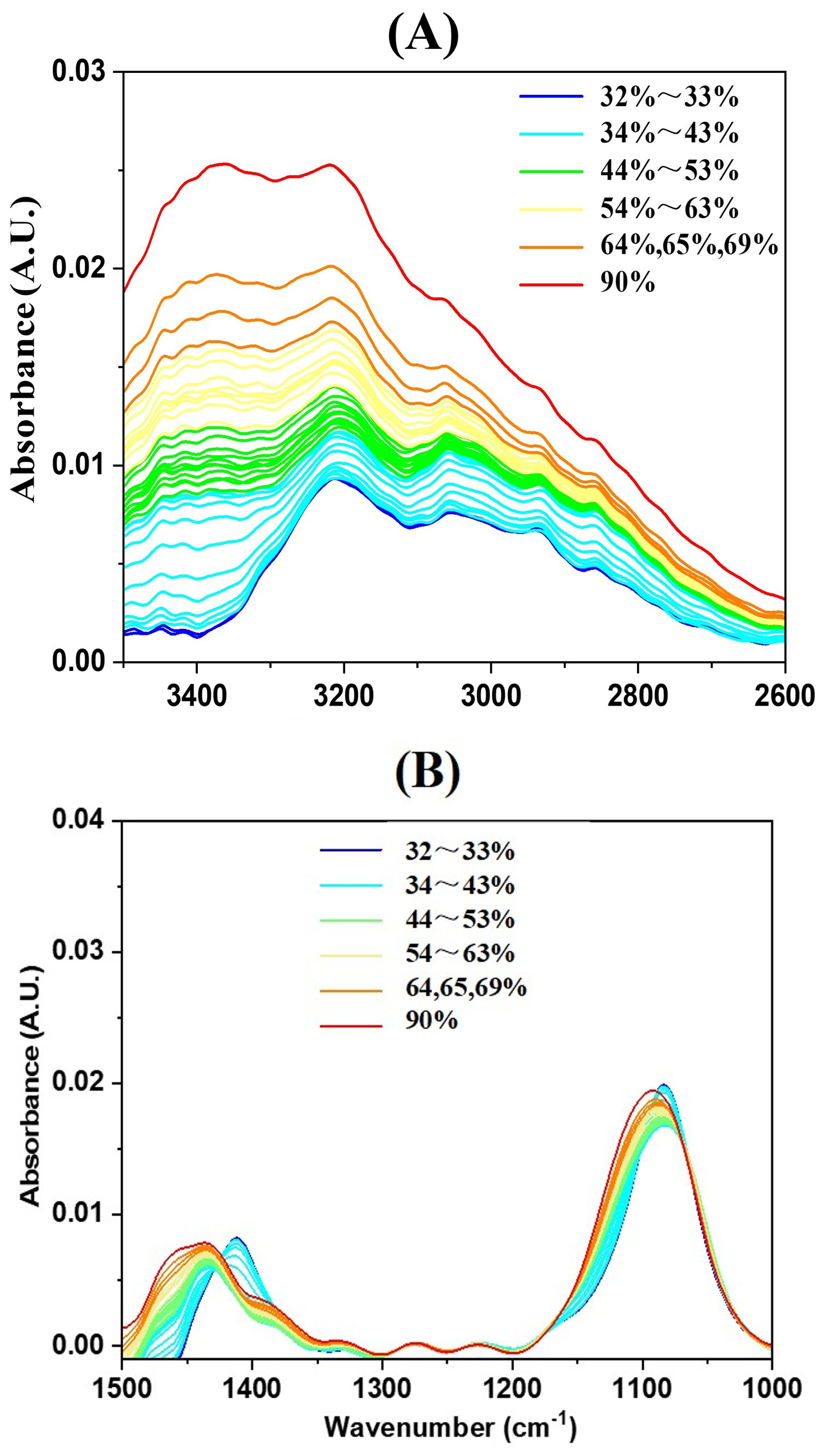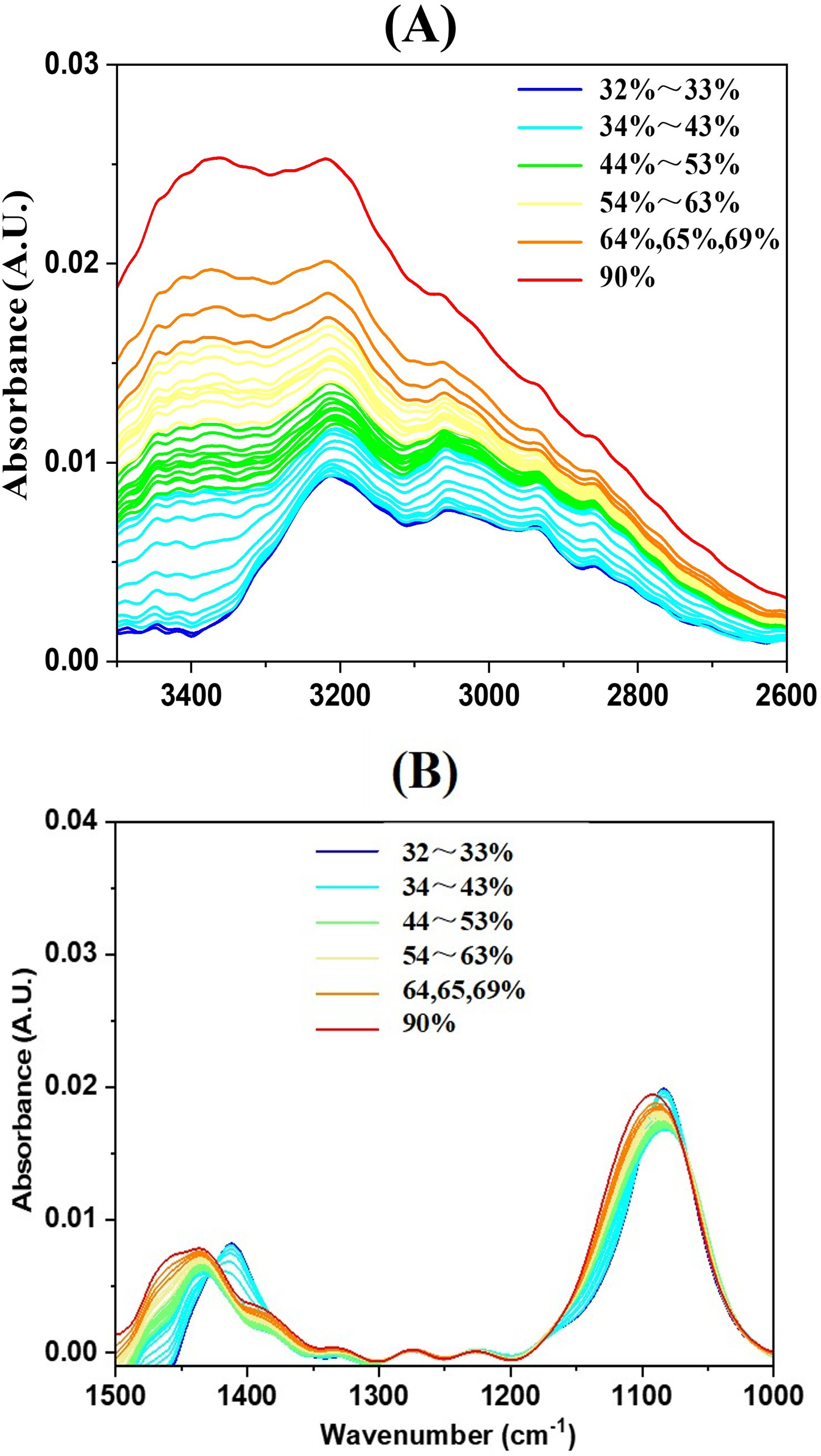 Figure 1Humidity-dependent FTIR spectra of AS particles upon efflorescence from 65 %–32 % at a rate of 1 % RH. (A) 3600–2550 cm−1; (B) 1500–1000 cm−1.