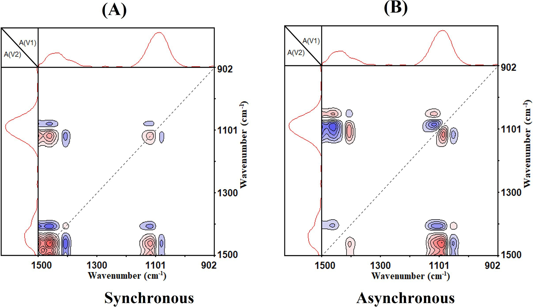 PCMW2D correlation infrared spectroscopy serves as a powerful tool for recognizing characteristic spectral variation along the perturbation variable axis (Noda, 2025; Noda et al., 2025; Morita et al., 2006). This technique generates complementary synchronous and asynchronous 2D correlation spectra, visualized as contour maps with spectral variables (e.g., wavenumber) plotted against perturbation parameters (e.g., relative humidity), enabling precise identification of transition points and critical regions. Consequently, PCMW2D proves particularly valuable for elucidating complex environmental processes through its distinctive analytical capabilities. In the resulting 2D-IR spectra, red-colored regions indicate positive correlation intensities, whereas blue-colored regions denote negative correlation intensities. Within synchronous correlation maps, these positive and negative correlations correspond to enhanced and diminished spectral intensity variations along the perturbation gradient, respectively. The asynchronous spectra reveal more nuanced behavior: positive correlations signify convex spectral intensity profiles along the perturbation axis, while negative correlations indicate concave profiles. Specifically, positive asynchronous correlation intensities manifest as convex curvature in RH-dependent FTIR spectral variations, with negative intensities conversely reflecting concave variation patterns.