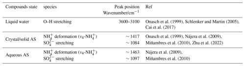 In this study, the spectra were collected with a 1 % (RH) at intervals. For liquid water, crystal/solid AS, and aqueous AS, their infrared absorption peaks are mainly observed in 3550–2500 and 1500–1000 cm−1 regions (Onasch et al., 1999; Wei et al., 2022; Nájera et al., 2010). For clarity, the detailed assignments of the infrared spectra bands are listed in Table 1.