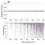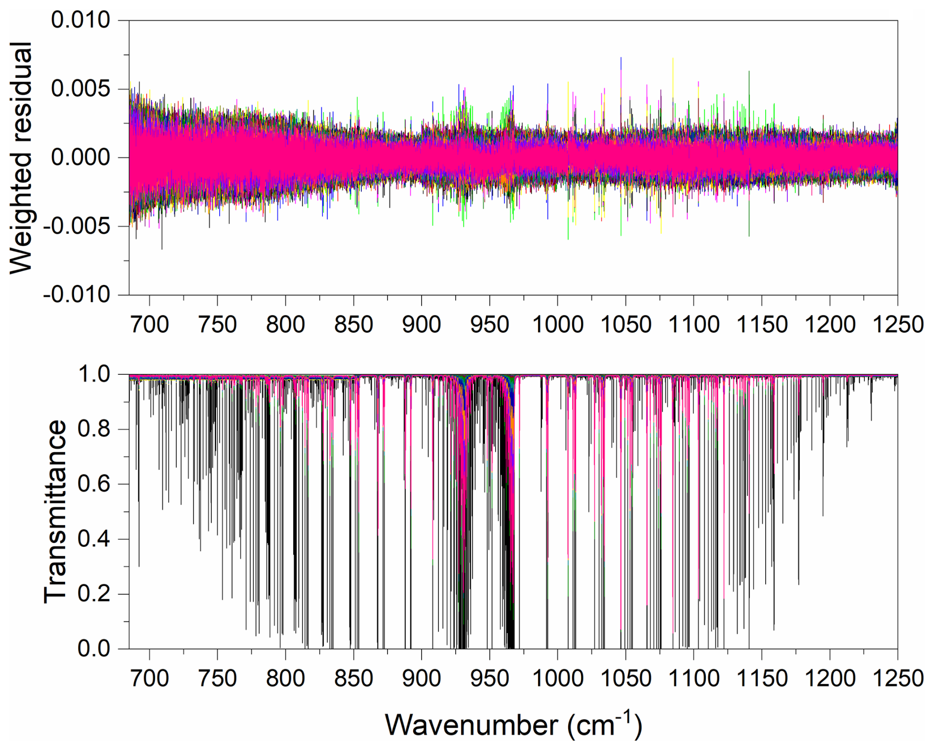 Figure 2Overlay of all the transmittance spectra across the entire measured spectral region, 685–1250 cm−1, alongside their weighted fit residuals, defined as the difference between the observed and calculated spectra.