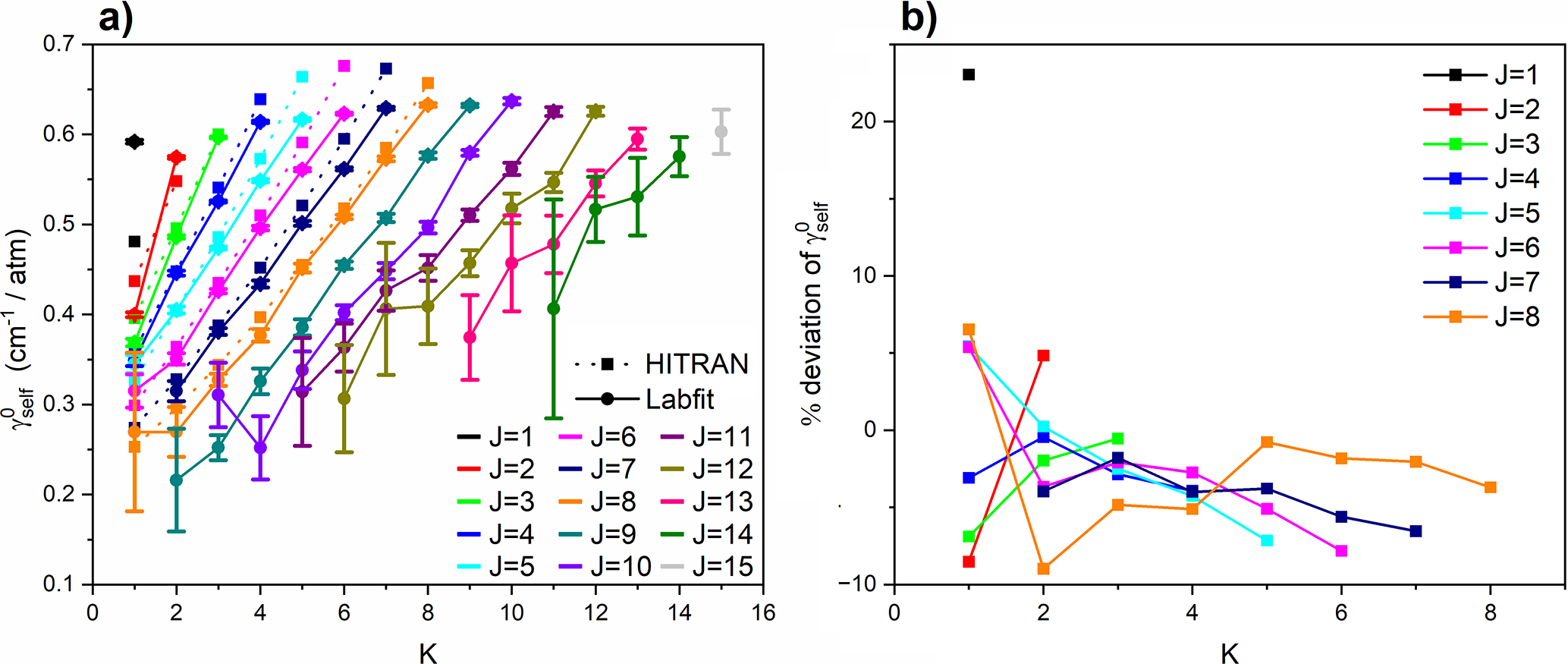 Figure 5Plots of (a) self-broadened halfwidth, γself0, and (b) percentage deviations from HITRAN of γself0 plotted against K for each J value of the ν2(a)←GS(s) Q branch. The Labfit values of γself0 are included with uncertainties of 3σ. For J> 8, HITRAN values for the self-broadened halfwidth were all set to 0.5, so percentage deviations have not been calculated for these cases.