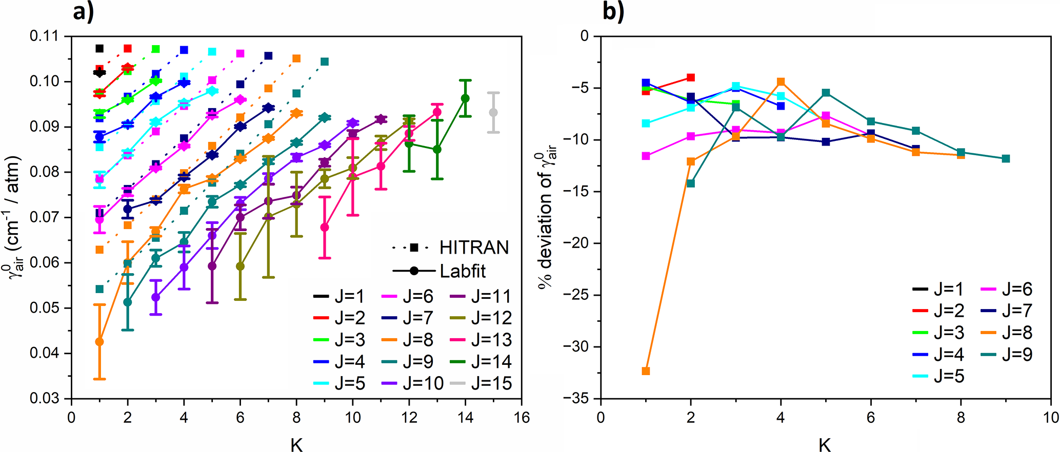 Figure 6Plots of (a) air-broadened halfwidth, γair0, and (b) percentage deviations from HITRAN of γair0 plotted against K for each J value of the ν2(a)←GS(s) Q branch. The Labfit values of γair0 are included with uncertainties of 3σ. For J> 9, HITRAN values for the air-broadened halfwidth were set to the same value as their corresponding K value at J= 9 (with values of K> 9 set to the value for K= 9), so percentage deviations have not been calculated for these cases.