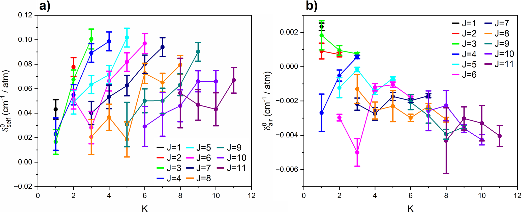 Figure 7Plots of (a) self-pressure-induced shifts, δself0, and (b) air-pressure-induced shifts, δair0, against K for each J value of the ν2(a)←GS(s) Q branch. Measured values are plotted with uncertainties of 3σ. The HITRAN 2020 database does not include values for these parameters.