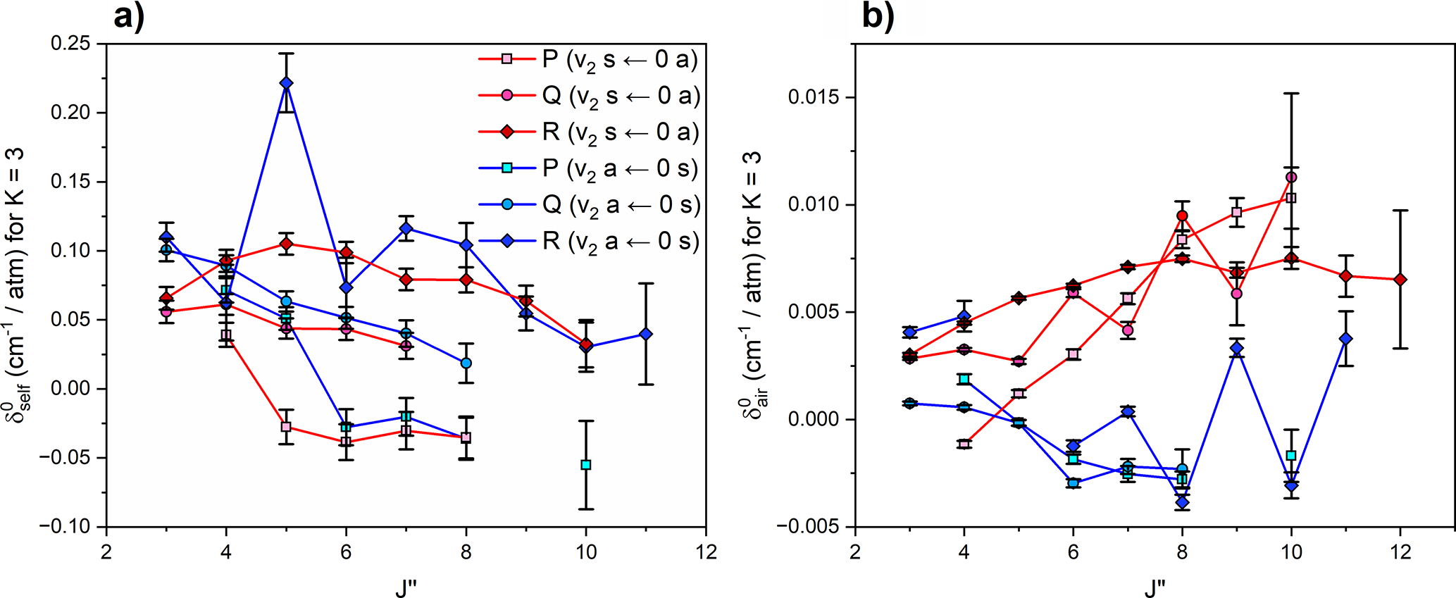 Figure 8Plots of (a) self-pressure-induced shifts, δself0, and (b) air-pressure-induced shifts, δair0, against J′′ for K= 3, for the P, Q and R branches of the ν2(s)←0(a) and ν2(a)←GS(s) transitions. The present measured values are given with uncertainties of 3σ. The HITRAN 2020 database does not include values for these parameters in this band.