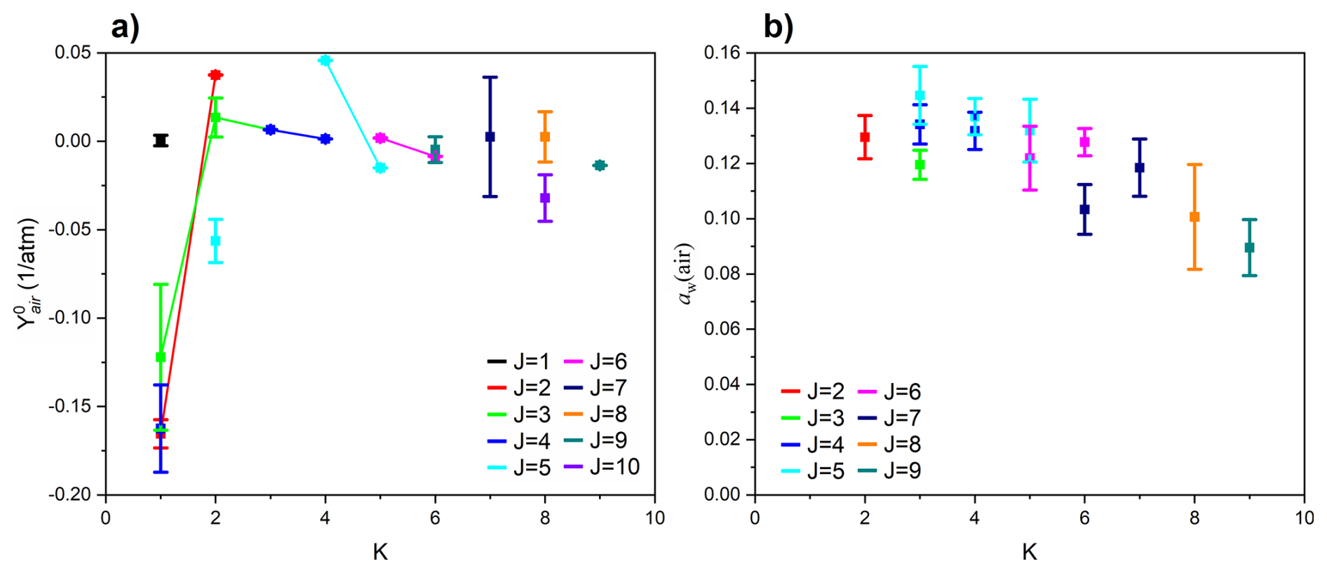 Figure 10b provides a plot of the speed dependence of the width parameter, aw(air), where this parameter was determinable, against K for lines in the ν2(a)←GS(s) Q branch. The results show a decrease in aw as J and K increase, although this trend is not observed in the Q branch for the ν2(s)←GS(a), where aw remains constant across all values of J and K. We report an average value for aw of 0.131 for ν2(a)←GS(s) and 0.118 for ν2(s)←GS(a).