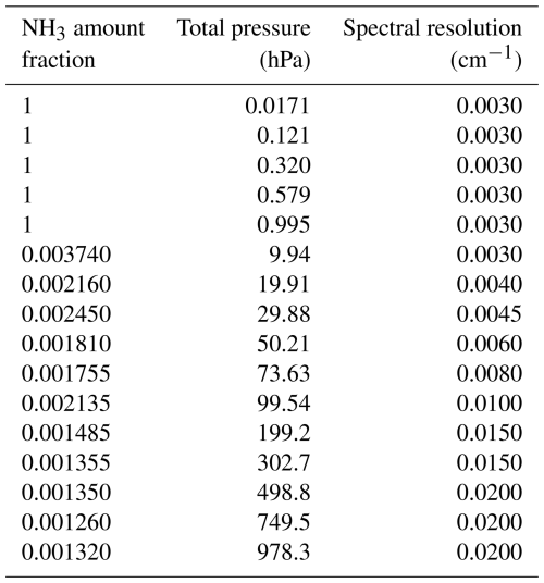 Sample gas mixtures were made from high purity gases, namely NH3 (BOC; 99.98 % purity) and dry synthetic air (primary reference material (PRM) from the National Physical Laboratory (NPL); 0.95 % Ar, 20.95 % O2 in N2, relative uncertainties Ar 1.0 %, O2 0.2 %). For the pure NH3 measurements, a spectral resolution of 0.003 cm−1 was used, defined as the Bruker instrument resolution of 0.9 per MOPD; MOPD = maximum optical path difference. For the air-broadened measurements, the spectral resolution was reduced according to the linewidth, with a lowest resolution of 0.02 cm−1 used where the total pressure approached 1000 hPa. Table 2 lists the pressures and resolutions selected for the measurements, which were optimised for the Earth's atmospheric conditions. These mixtures were found to be stable for many hours of scanning, with no signal degradation observed that might otherwise be attributed to reactions with the cell windows, for example. For the analysis, NH3 spectra were ratioed against appropriate empty cell spectra (taken at 0.03 cm−1 spectral resolution) to produce transmittance spectra. The generation of these transmittance spectra was handled by the Bruker OPUS program, which zero-fills the backgrounds to provide a point-by-point division on the grid of the single channel sample scans. These spectra were unapodised except for the highest resolution measurements (< 0.005 cm−1, equivalent to MOPD > 180 cm) for which the following apodisation function (ap) was applied (Devi et al., 2003):