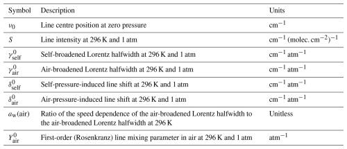 Table 9Average absolute position differences, and percentage deviations of intensity and Lorentz halfwidths between parameters derived in this work and those in HITRAN 2020 (Gordon et al., 2021); the percentage deviations are calculated as 100 (Labfit / HITRAN  1). The values were determined from lines with intensity S> 1 × 10−21 cm−1 (molec. cm−2)−1 at 296 K. Halfwidth deviations were only determined for those lines with distinct halfwidth parameters for the analogous lines in HITRAN 2020, as opposed to set values discussed in Sect. 4.4.
