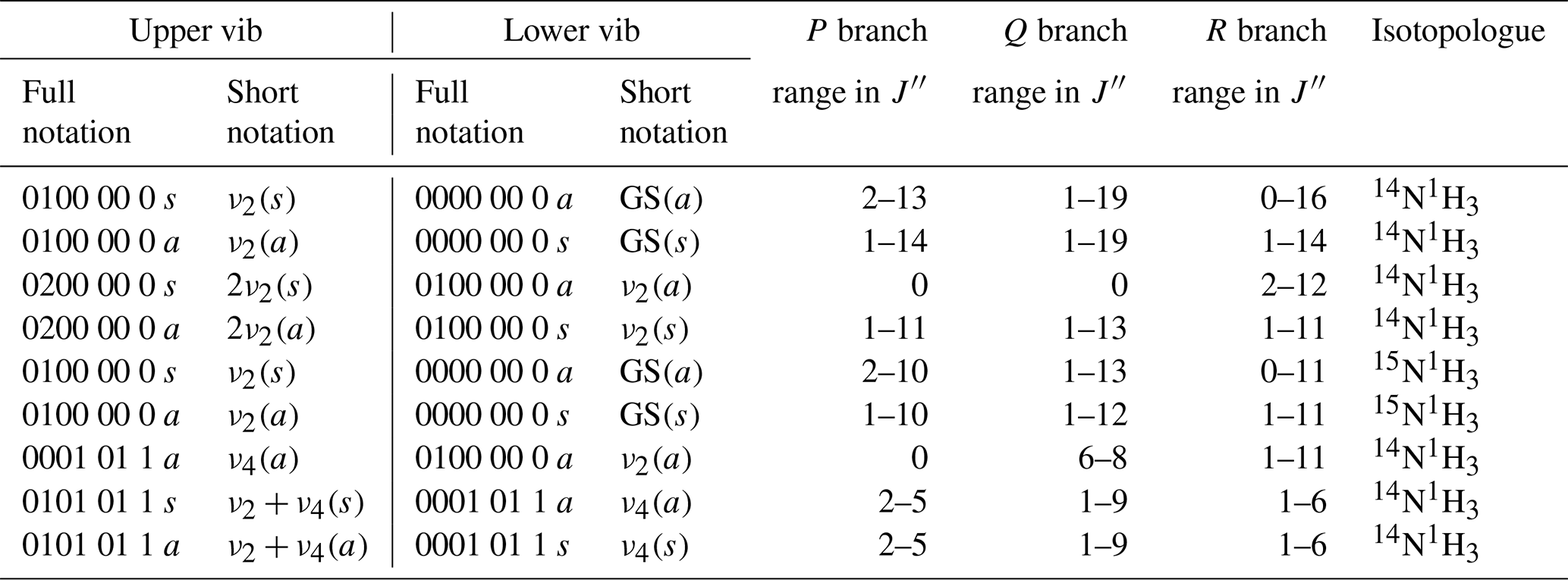Table 4Main NH3 bands analysed in this study within the 685–1250 cm−1 spectral region. Some bands were only partially observed in the spectral window, for which only R branch lines were fit. The number ranges in columns 5 to 7 denote the range of analysed J′′ values for the observed transitions. However, a number of lines associated with K sub-levels are not included in the fit if the relevant lines are either outside the measured spectral window or have an intensity below the fitting threshold of 1 × 10−23 cm−1 (molec. cm−2)−1 at 296 K.