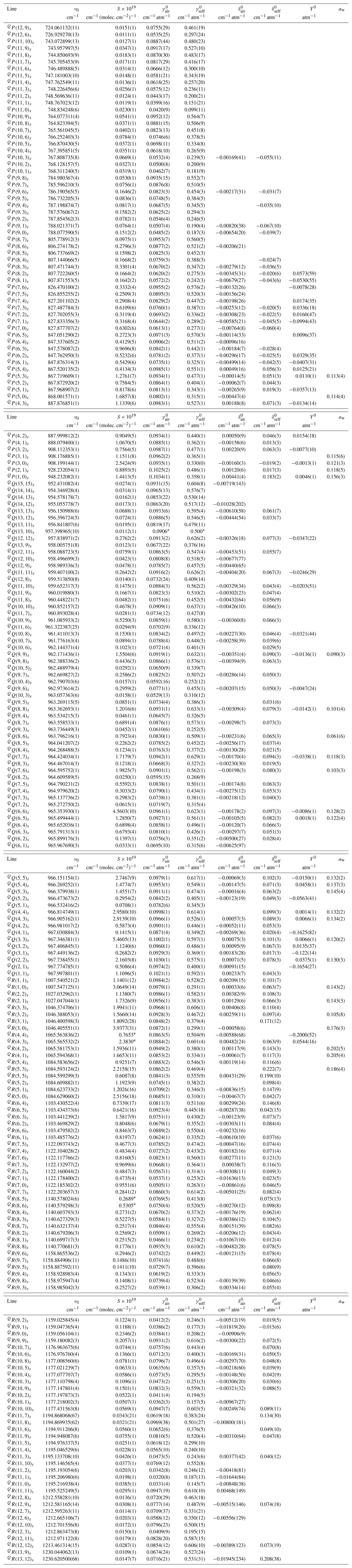 The principal focus of this work is the ν2 band, however there are a number of other weaker bands present in the spectral region of interest. Table 4 lists the vibrational assignments of these bands along with the rotational lines and isotopologues that were included in the fit. In total, parameters were fit for 1374 lines with intensities above a threshold of 1 × 10−23 cm−1 (molec. cm−2)−1. For the weakest of these lines, only positions and intensities were determined; for the strongest, the whole suite of parameters listed in Table 3 were determined. In general, self- and air-broadened Lorentz halfwidths were fit for lines with intensities above 4 × 10−22 cm−1 (molec. cm−2)−1 and self- and air-pressure-induced shifts for lines with intensities above 1.5 × 10−21 cm−1 (molec. cm−2)−1. Selected lines of intensity > 7.5 × 10−21 cm−1 (molec. cm−2)−1 were fit for one or both of speed dependence and Rosenkranz line mixing parameters. The total number of each type of line parameter determined for each of the bands listed in Table 4 is given in Table 5.