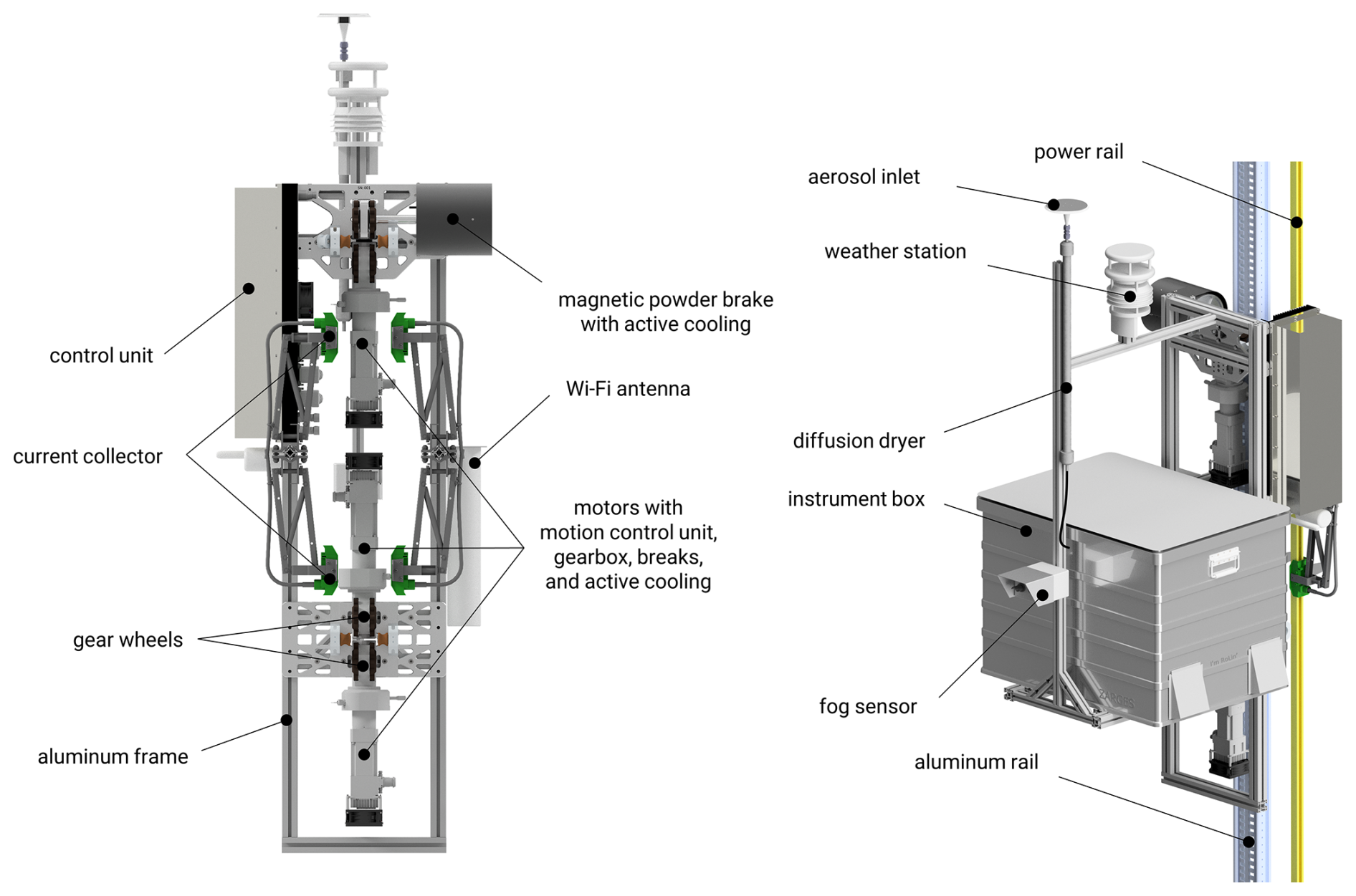 Figure 1Overview of the major RoLi components. The view on the left shows the rear of RoLi, with the major components labeled, while the right view illustrates the front, including the mounted instrument box and tower rails. During operation, the four current collectors, with two on each side, are connected to the power rails, which operate at 230 VAC. This voltage is directly utilized to power the scientific instruments. Within the control unit, an internal power supply transforms the voltage to 48 VDC to supply the RoLi subsystems, particularly the motors. The three motors, along with their gearboxes and brakes, are securely mounted onto the RoLi frame. The instrument box is fully modular and can be easily removed if needed. The aerosol inlet head is positioned on top of the diffusion dryers, while the pumps used for creating the vacuum needed for sample air dehumidification are housed inside the instrument box. The weather station is also mounted on the aluminum frame, directly above the instrument box, ensuring seamless integration with the lift system. The main connection to the control unit on the ground is via WiFi.