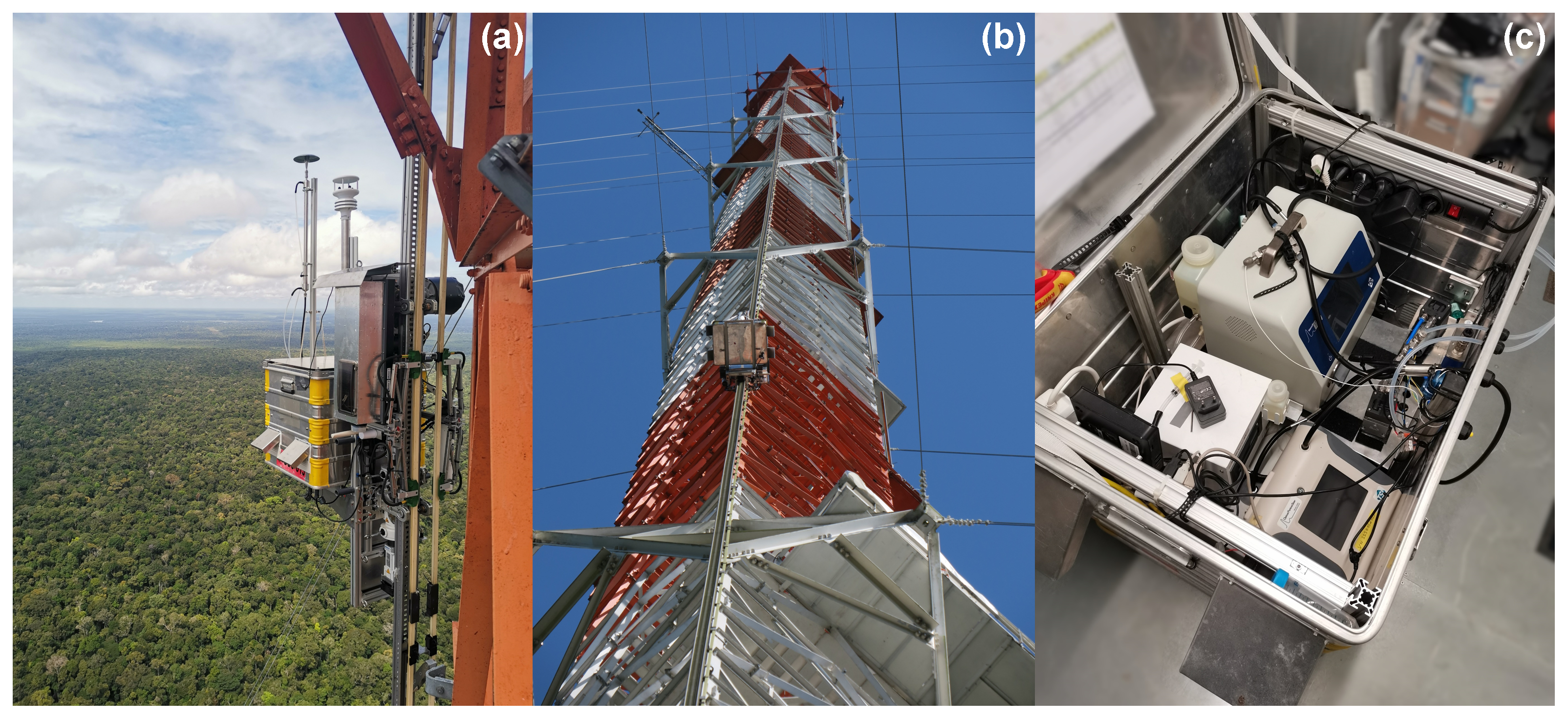 The Amazon Tall Tower Observatory (ATTO) was established in 2012 about 150 km northeast of Manaus as a long-term and continuous measurement station (Andreae et al., 2015; Pöhlker et al., 2019). The central infrastructure of the project is the 325 m tall tower, which enables continuous measurements of atmospheric parameters at the forest–atmosphere interface and throughout the lower planetary boundary layer (PBL). Tall towers exist at several locations worldwide (Heintzenberg et al., 2011; Kohler et al., 2018; Meng et al., 2020; Dvorská et al., 2015) and provide continuous and highly time-resolved measurements at multiple heights across the lower PBL, capturing both local processes near the surface and regional signals in the lower layers of the troposphere. Tall tower measurements help to constrain the interplay of different trace gas and aerosol sources, related to (tropical) meteorology including the formation and dissipation of stable nocturnal and convective daytime boundary layers, intermittent turbulent structures, and the entrainment of air masses from higher altitudes (Fisch et al., 2004; Li et al., 2010; Oliveira et al., 2020). Complementary to smaller flux towers, which measure at or above canopy height and have a limited footprint area, tall towers have significantly larger footprints and thus capture atmospheric signals that reflect spatially integrated processes over broader regions (Pöhlker et al., 2019). A focal point at ATTO has been the research on atmospheric aerosols and their effects on radiative transfer (Liu et al., 2020; Morais et al., 2022; Holanda et al., 2023), cloud and precipitation formation (Pöhlker et al., 2018, 2023; Efraim et al., 2024), and ecosystem processes (Löbs et al., 2020; Prass et al., 2021; Barbosa et al., 2022; Mota de Oliveira et al., 2022). Especially for trace gas, aerosol, and cloud cycling, tall tower measurements provide unique data to document the baseline conditions in currently still untouched regions of the Amazon, as land use and climate change continue to reshape the rain forest ecosystem.