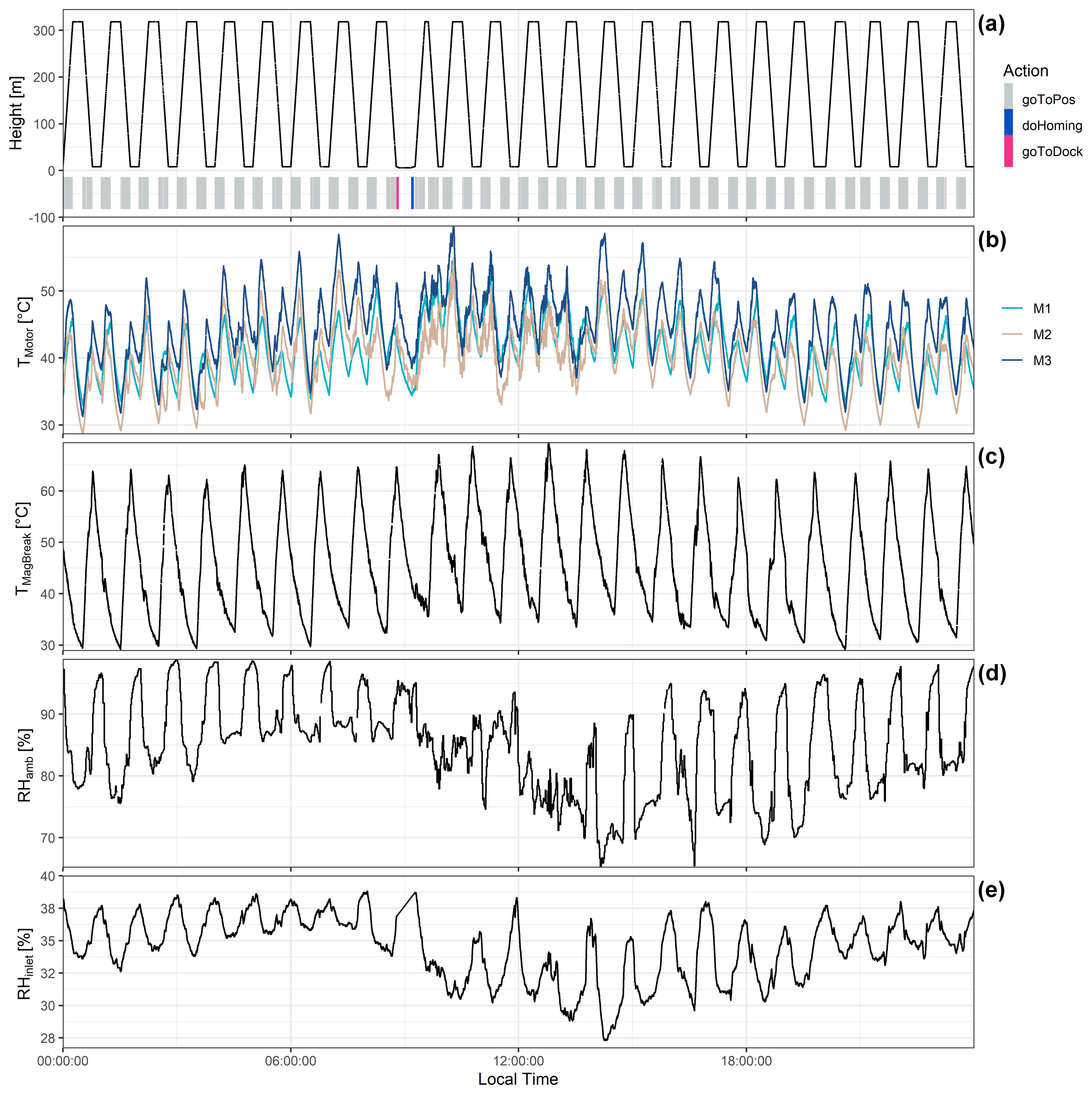 During normal operation, 48 profiles per day were measured with a payload of around 70 kg (Fig. 3a). Upward profiles were always scheduled to begin on the hour and were completed about 15 min later at the top of the tower, driving a speed of 0.33 m s−1. The 15 min waiting time at the top of the tower allowed the motors to cool down and provided an opportunity to compare the RoLi instrument data with measurements from permanently installed instrumentation at the top of the ATTO tower. These include continuous measurements of aerosol number size distributions (∼ 10–400 nm, SMPS), aerosol number concentration, aerosol mass (PM2.5 and PM10), black carbon, ozone, VOCs, CO2, and basic meteorological parameters, enabling effective intercomparison and calibration of the RoLi system. After the 15 min waiting period, downward profiles were started, followed by another 15 min waiting time before starting the next upward profile on the following hour. Especially during daytime, high ambient temperatures and intense solar radiation posed limitations due to the risk of overheating RoLi components during operation. This issue was particularly critical during upward movements, as the motors generate significant heat that must be effectively dissipated to prevent overheating. During downward movements, motor heating was less of a concern compared to upward movements. However, the potential energy from the high elevation must still be dissipated with the magnetic powder brake. The chosen movement pattern proofs to provide sufficient time for the motors and brakes to cool down during the waiting period as the maximum motor temperature appears to consistently remain below 60 °C (Fig. 3b and c).