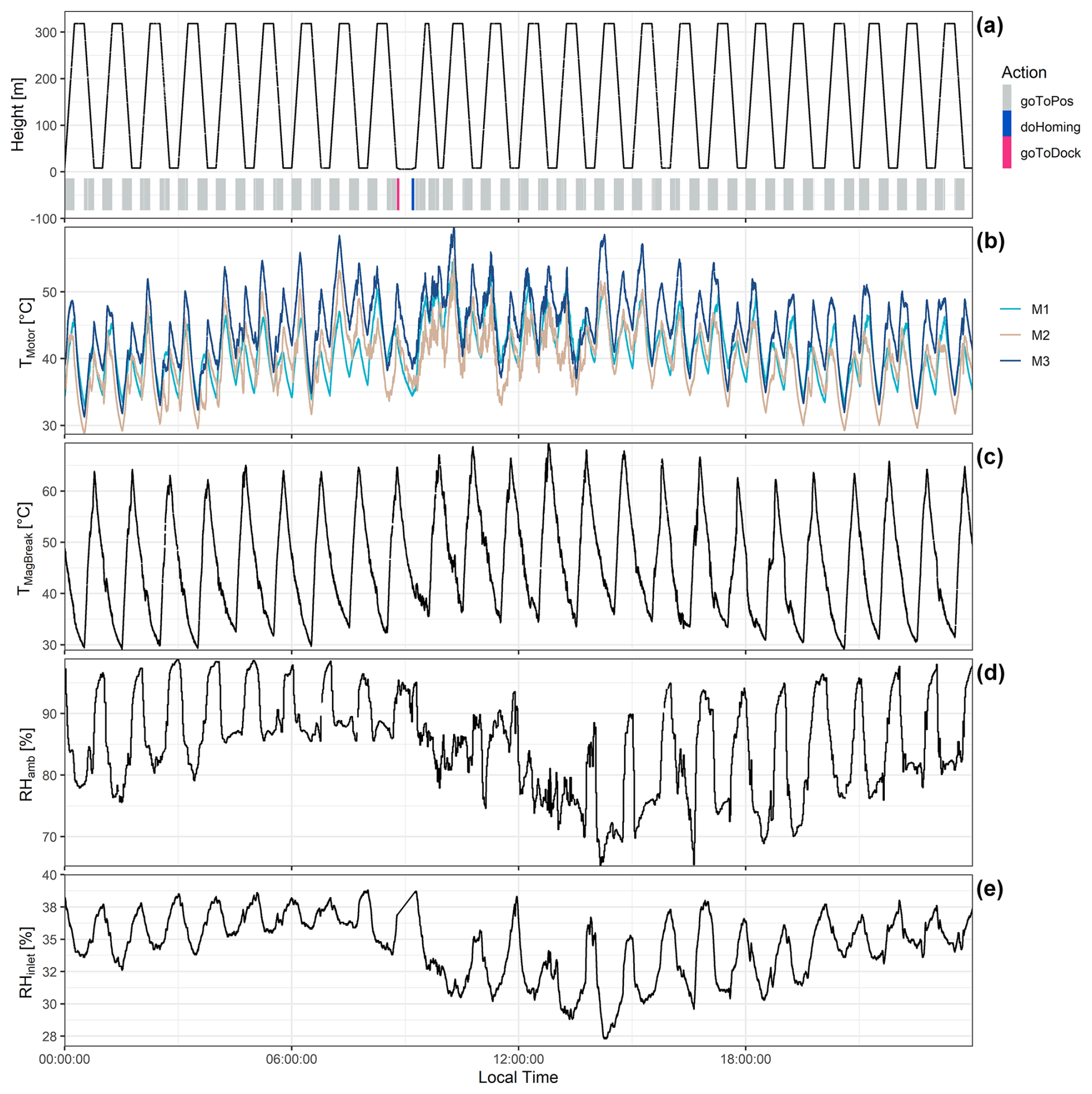 Figure 3Exemplary RoLi housekeeping data for 24 h of operation on 8 January 2023, illustrating the detailed observation and documentation of the system performance. The regular movement pattern followed a daily cycle of 48 profiles, with two profiles measured per hour at a speed of 0.33 m s−1. Each profile took approximately 15 min to be measured. Between profiles, there was always a waiting period of around 15 min to allow the motors and brakes to cool down. Around 09:00 local time (LT), a daily hardware check was performed, which involved driving RoLi down to the dock position and then back up to the home position. (a) Position data of RoLi and commands sent by the software. (b) Temperature data for the three motors M1, M2, and M3 (also reflecting the temperatures of the gearbox and parking brake). (c) Temperature of the magnetic powder brake. (d) Ambient relative humidity measured with the weather station. (e) Relative humidity of the sample air measured at the SMPS sheath flow.