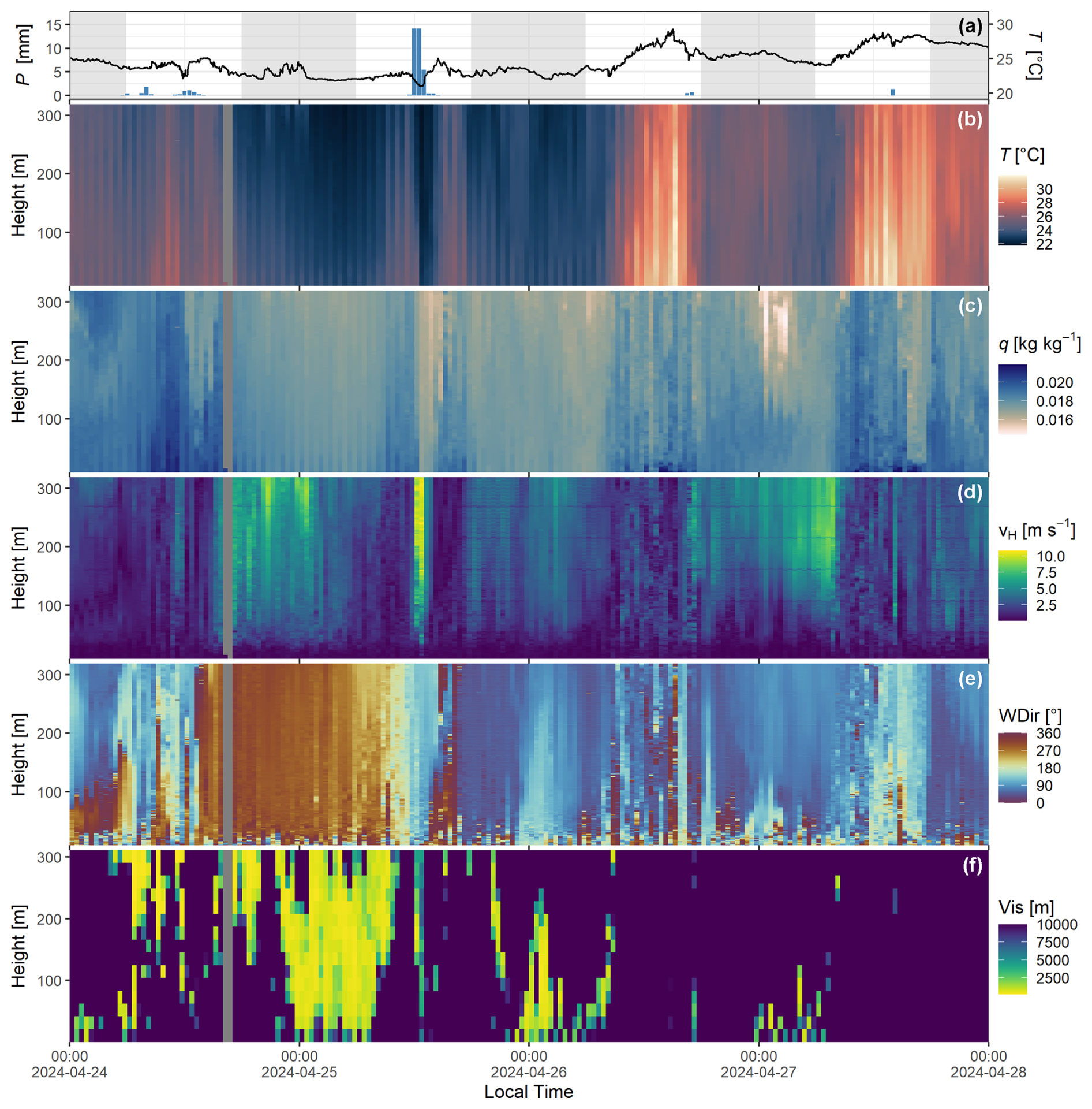 Fog was observed on all 4 d shown, particularly during the nighttime hours (Fig. 4f). The most extensive fog occurred during the night of 24–25 April, extending from ground level to the top of the tower. In contrast, during the subsequent two nights, fog was primarily confined to the lower levels, reaching up to approximately 200 m, with the highest occurrence just above the canopy. A characteristic feature of fog behavior is its upward movement in the early morning, as solar heating initiates convection, leading to the formation of the convective boundary layer (CBL). The development of the CBL lifts the fog upwards, as clearly depicted in Fig. 4f. Additionally, the strong rain event on 25 April and the minor rain event on the afternoon of 26 April are evident in the visibility data. Visibility decreases not only due to fog but also as a result of biomass burning smoke or heavy rainfall, as seen during these events.