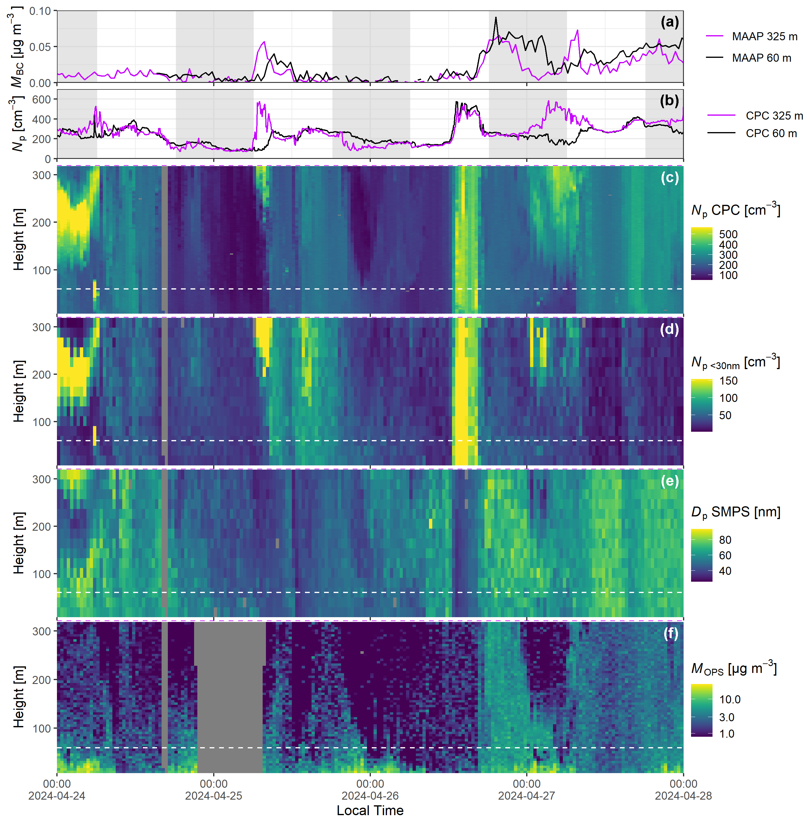 Figure 5Vertical profile, BC, and particle number concentration data from 24 to 27 April April 2024: (a) BC mass concentration measured at 60 m (at the 81 m Tower) and 325 m with a Multi-Angle Absorption Photometer (Model 5012 MAAP, Thermo Scientific, 27 Forge Parkway, Franklin, MA 02038) and (b) total particle number concentration measured at 60 m (at the 81 m Tower) with the MAGIC CPC (Aerosol Devices, 1613 Prospect Park Way, Suite 100, Fort Collins, CO 80525, USA) and at 325 m with the GRIMM CPC 5414 (DURAG GROUP, Headquarters, Kollaustraße 105, 22453 Hamburg, Germany). (c–f) Vertical profile data measured with the robotic lift: (c) total particle number concentration measured with the MAGIC CPC; (d) particle number concentration below 30 nm, measured with the NanoScan SMPS; (e) median particle diameter, measured with the NanoScan SMPS; and (f) particle mass concentration, measured with the OPS. The two fixed inlet measurement heights at 60 and 325 m from the tower are marked as horizontal dashed lines in the vertical profile panels. The grey shaded areas in panels (a) and (b) represent nighttime periods.