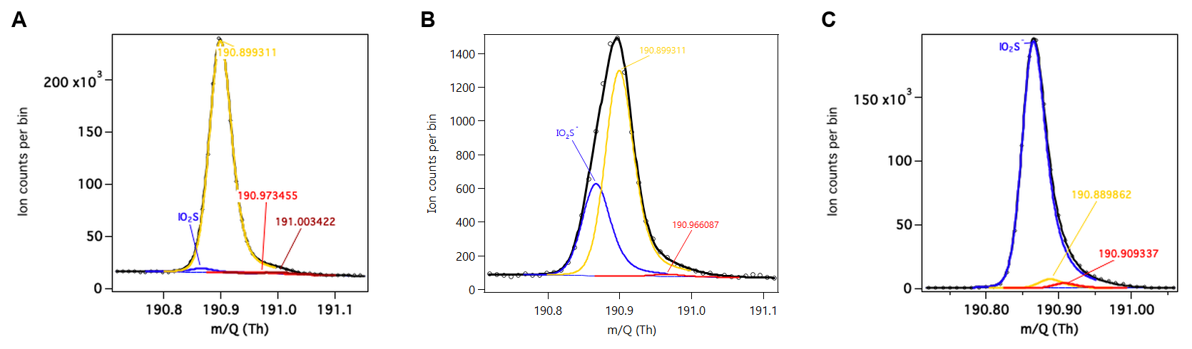 Figure 4High resolution peak fitting at 191 during ambient sampling in ACRUISE-3 for (A) average mass spectrum for flight C285 (left), (B) in a ship plume (middle) and (C) calibration using a commercial standard (right).