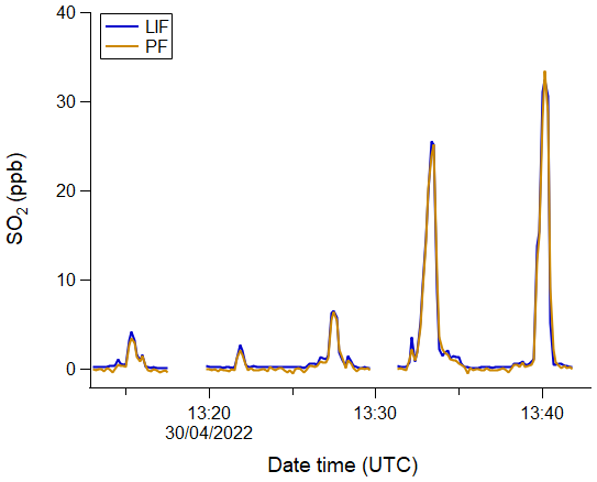 As part of the core instrumentation on board the FAAM aircraft, a commercial Thermo Fisher Scientific model TEi-43i TLE SO2 analyser was used to measure SO2 during the entire ACRUISE campaign. Based on the UV pulsed fluorescence (PF) technique, it uses a broader, non-tuneable SO2 excitation wavelength range compared to LIF and hence is more susceptible to interfering species. To minimise SO2 fluorescence quenching by water vapour, the PF analyser is equipped with an external Nafion dryer (PermaPure Multi-strand, PD-50T-24MPR). A heated hydrocarbon kicker is used to remove interferences caused by volatile organic compounds which fluoresce at similar UV wavelengths to that of SO2. Owing to their broad spectral features relative to SO2, these compounds do not interfere with SO2 mixing ratio measurements using the LIF technique, as they contribute equally to background counts at both the on-line and off-line wavelengths.