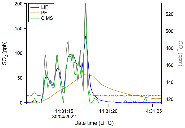 Figure 9Time series comparing instrument response time, matched by the increasing SO2 mixing ratio due to measurement of a ship plume during flight C285. The LIF data is presented at 5 Hz, the PF at 1 Hz, the I−CIMS at 4 Hz and the CO2 data at 10 Hz. To note, I−CIMS SO2 mixing ratios have been estimated based on the gradient of the fit to the LIF data (Fig. 8B).