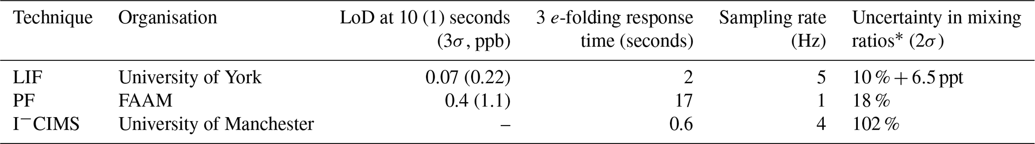 Table 1Comparison of LIF instrument, PF analyser and I−CIMS in terms of LoD, response time, sampling rate, and mixing ratio uncertainty as performed during the ACRUISE-3 campaign.