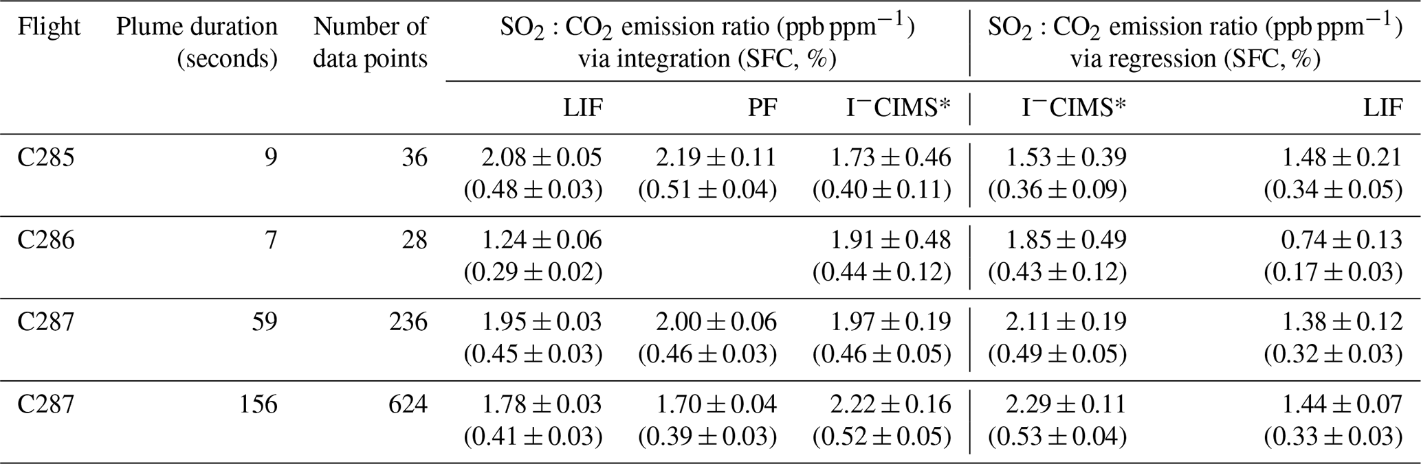Table 3Comparison of integration and regression methods for calculating SO2:CO2 emission ratios of four ship plumes during different flights. The LIF SO2, I−CIMS SO2 and CO2 data have been sampled to 4 Hz, however, the PF SO2 data is at 1 Hz. Emission ratio uncertainties have been given to a 2σ confidence interval. The corresponding sulfur fuel content (SFC) has been calculated via Eq. (2) and is given in brackets after each emission ratio. SFC uncertainties include an estimated 6 % error to account for the emission of sulfur as sulfate.