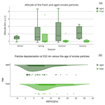 Figure 10 presents the distribution, central tendency, and spread of several lidar-derived intensive optical properties used to characterize fresh and aged smoke: (a) altitude, (b) linear particle depolarization ratio at 532 nm, (c) extinction-related Ångström exponent (AE), and (d) lidar ratio (LR) at 355 nm. Together, these panels provide a consistent physical picture linking smoke ageing to transport altitude, aerosol morphology, and optical signatures.