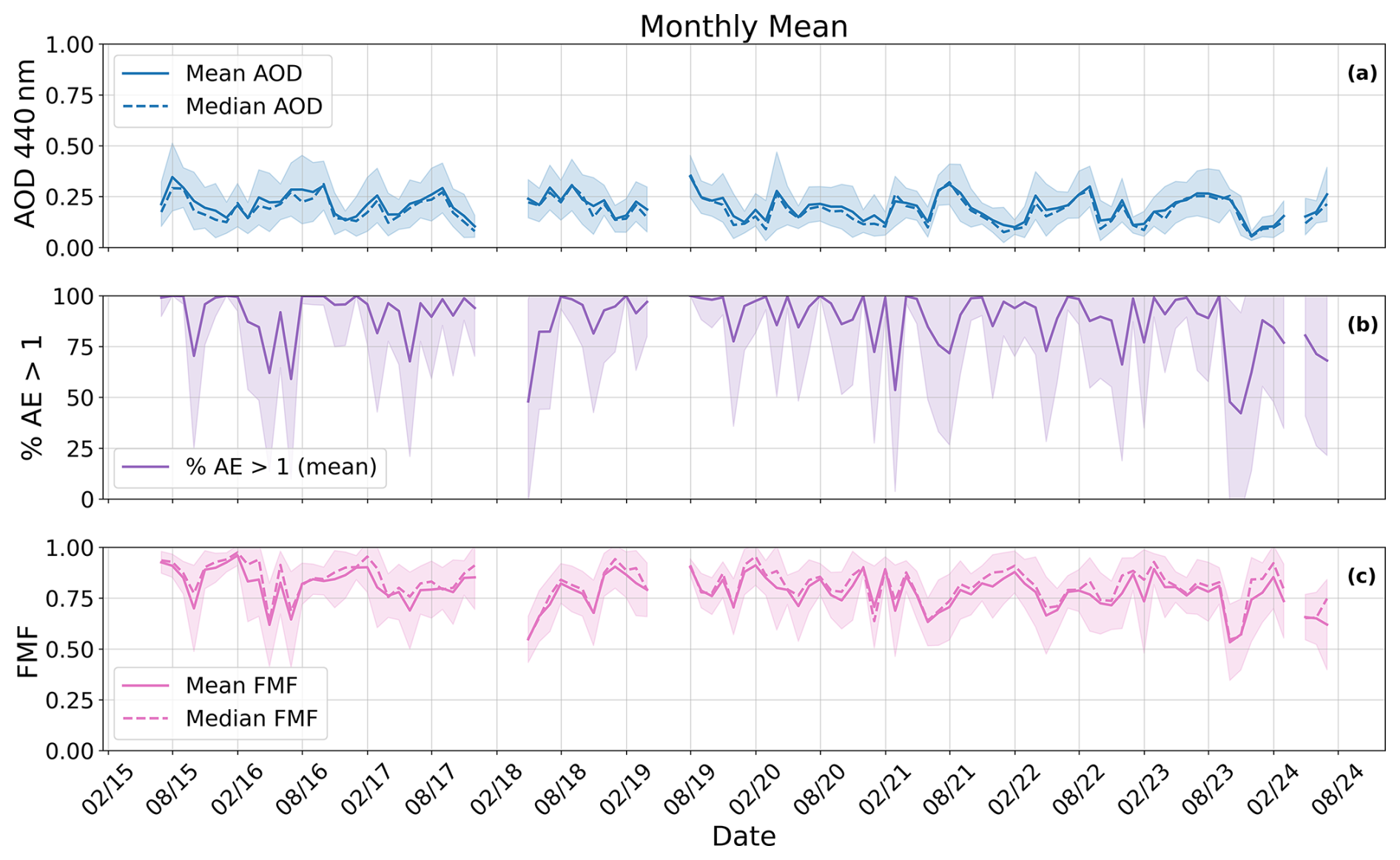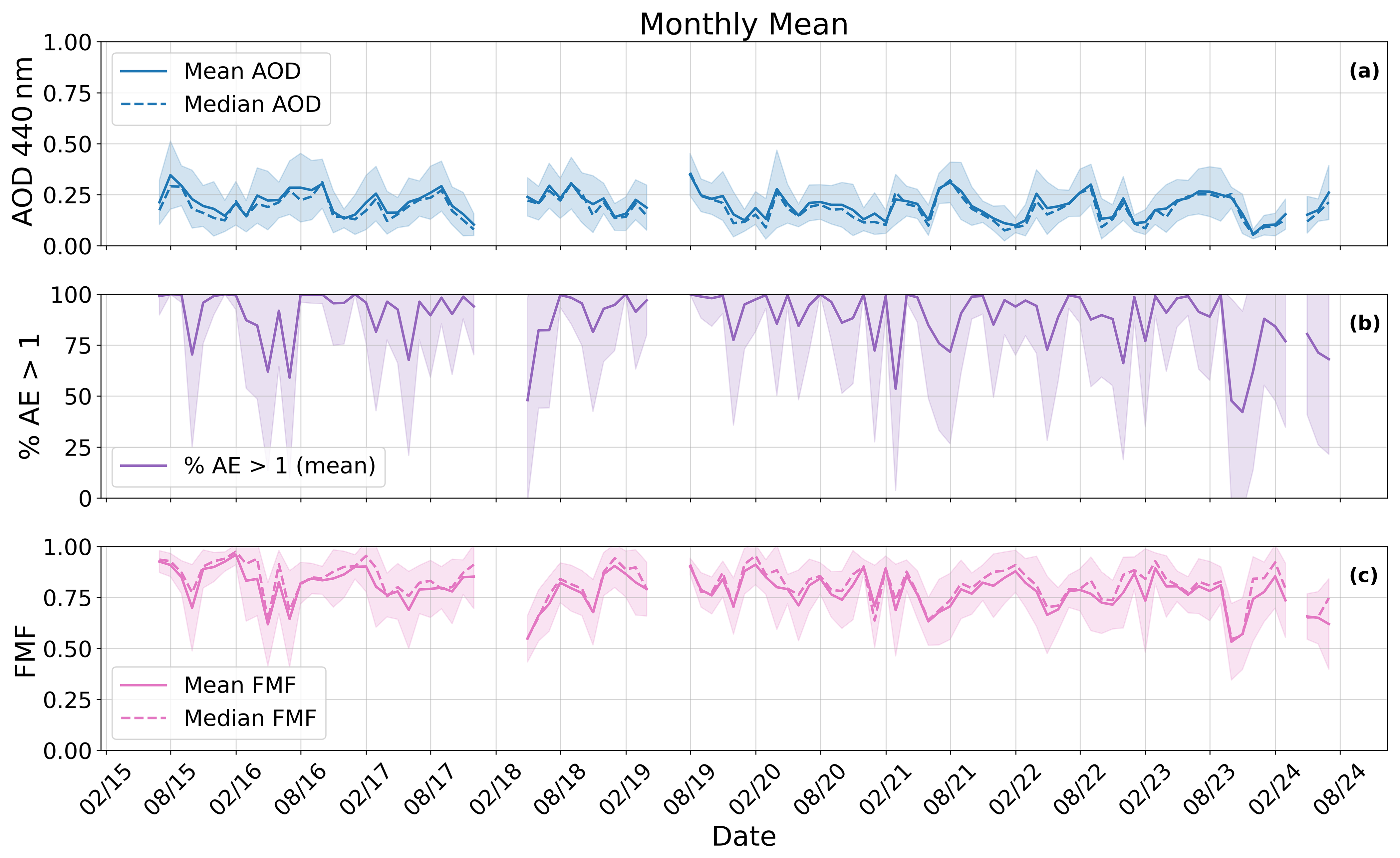 Figure 1Time series of monthly mean (solid line) and median (dashed line) values. Panel (a) displays the Aerosol Optical Depth (AOD) at 440 nm, indicating aerosol loading. Panel (b) displays the percentage of measurements where the Angstrom Exponent (AE) calculated between 440 and 870 nm is greater than 1. Panel (c) displays the Fine Mode Fraction (FMF) at 500 nm, representing the contribution of fine particles to the total AOD.