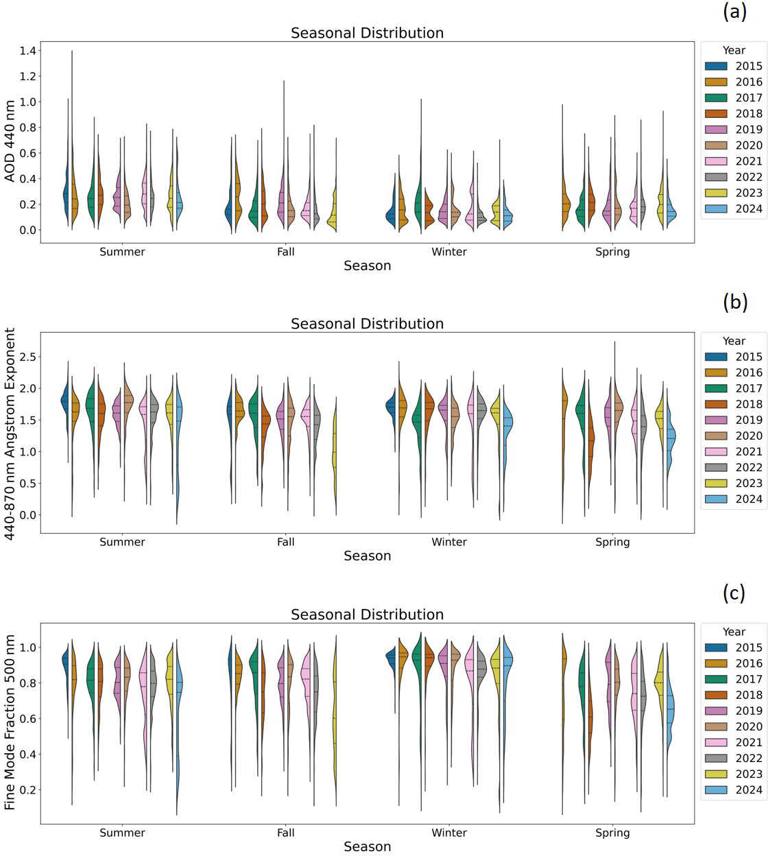 Figure 2Seasonal and inter-annual distribution of Aerosol Optical Depth at 440 nm (a), Angstrom Exponent (b), and Fine Mode Fraction (c). The violin plots illustrate the probability density function (distribution) of the measured values for each season and year. The width of the violin represents the density of the data points, where wider sections indicate more frequently observed values. The three dashed horizontal lines are as follows, in descending order from top to bottom: 75 % quartile, median, 25 % quartile.
