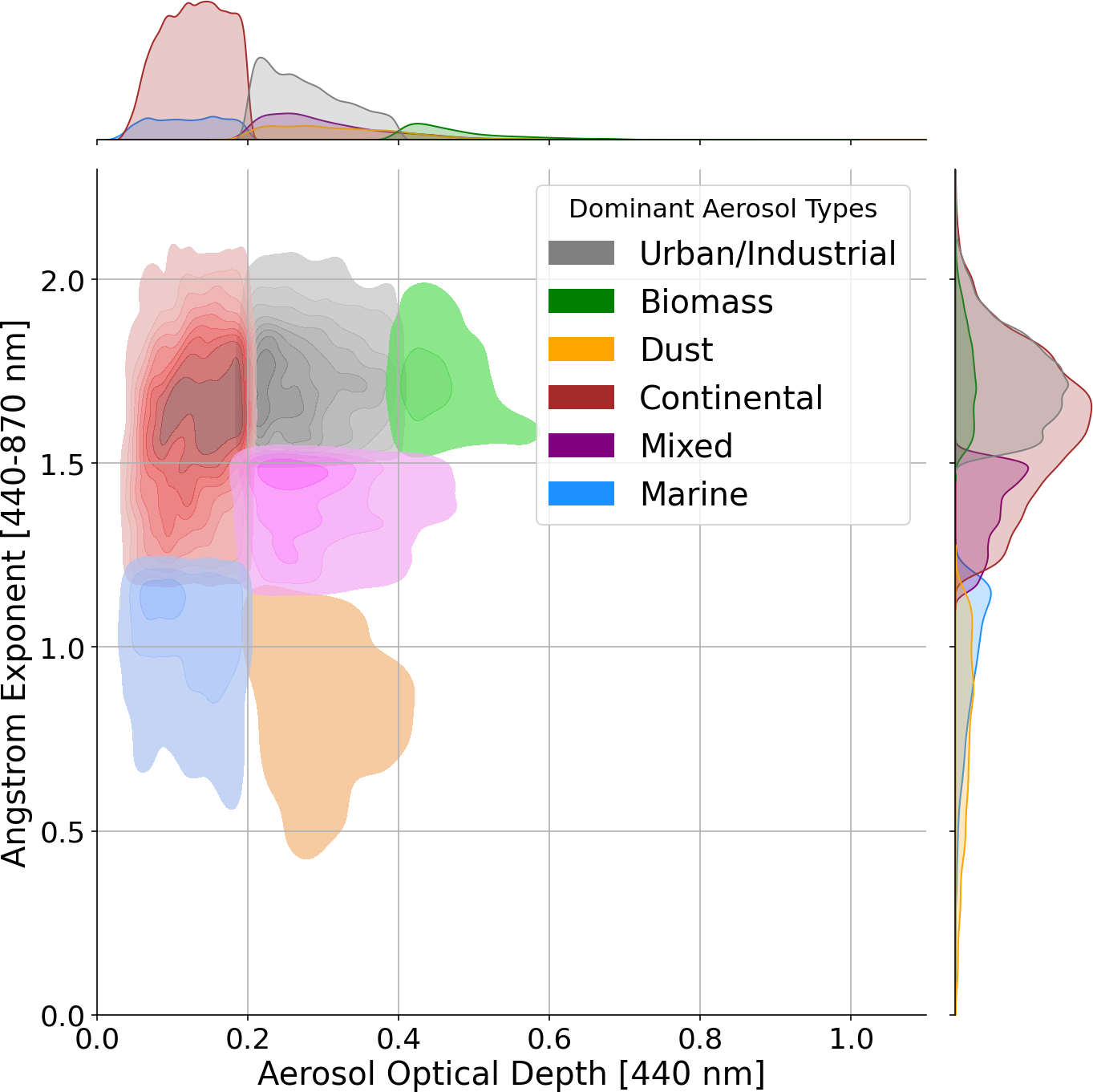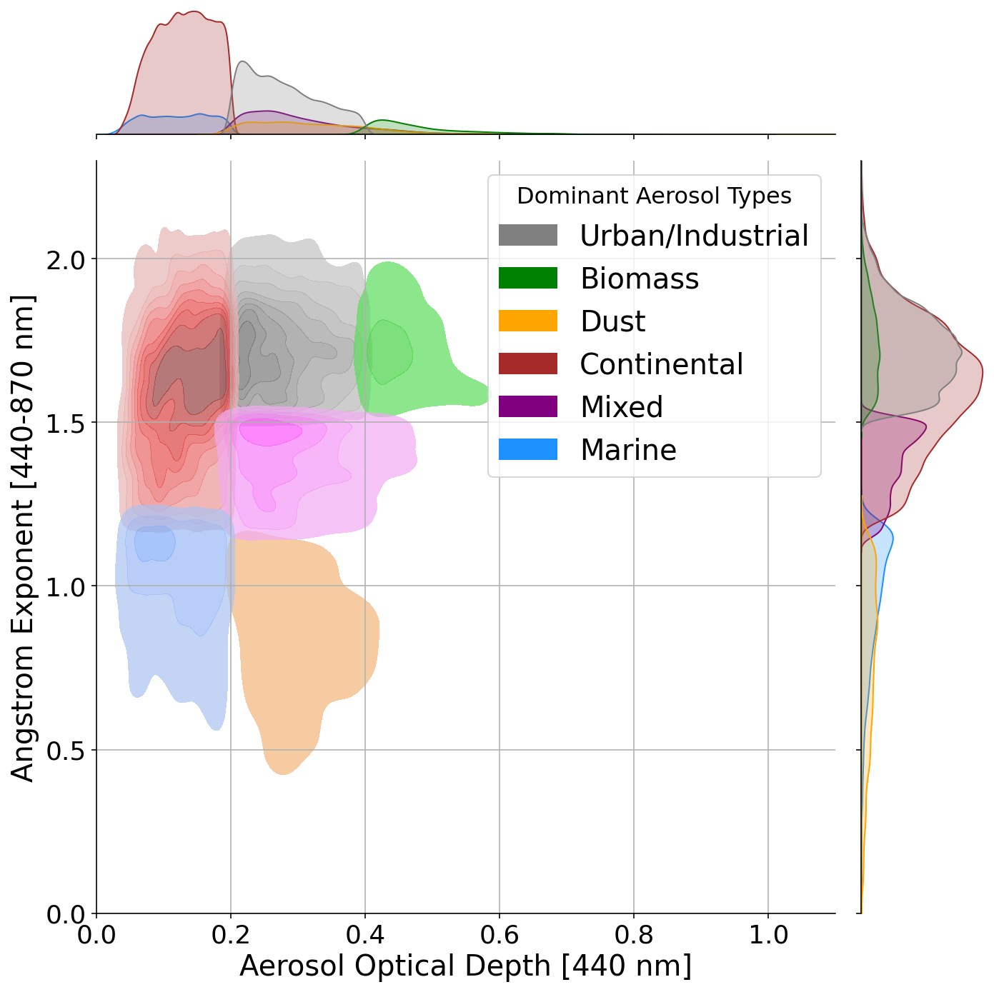 Figure 3Aerosol typing based on the joint probability density of AOD and AE. The 2D contour plot shows the relationship between AOD (x axis, aerosol loading) and AE (y axis, particle size). The density contours (colored regions) identify the dominant aerosol regimes: Urban/Industrial, Biomass, Continental, Mixed are fine-mode dominant, while Dust and Marine are coarse-mode dominant. The marginal distributions (top and right) show the density of AOD and AE values independently.