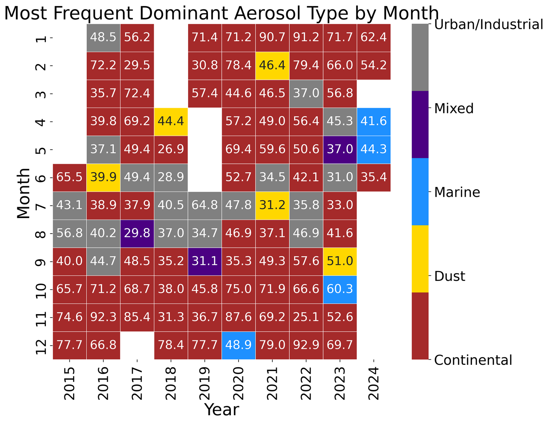Figure 4The heatmap displays the most statistically dominant aerosol type determined for each calendar month (y axis) and year (x axis) based on the classification presented in Fig. 3. The color coding corresponds to the aerosol type, and the numerical value within each cell indicates the percentage frequency of the dominant type during the month. White spaces indicate months with insufficient or no data.