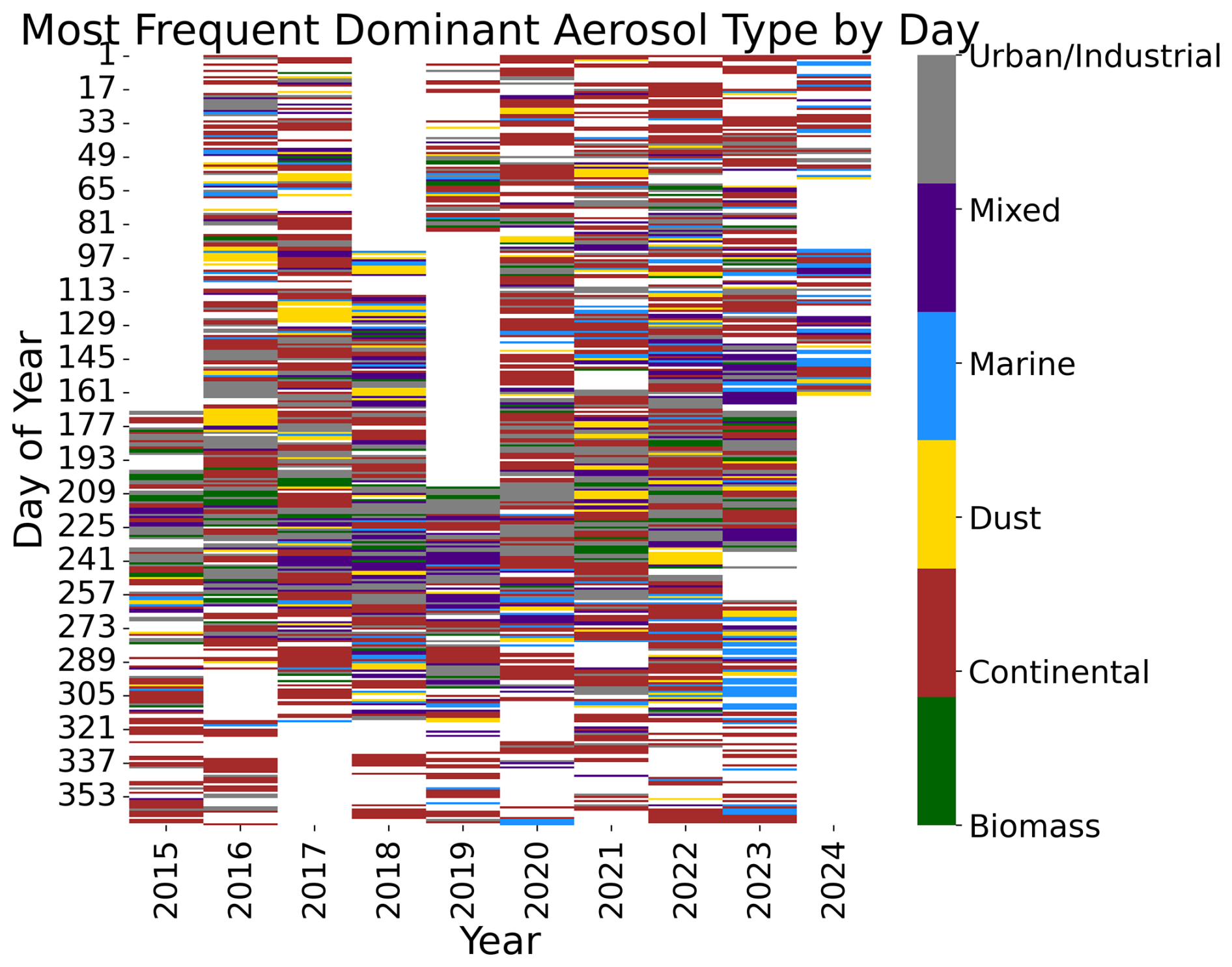 Figure 5The heatmap shows the dominant aerosol type for each recorded day (y axis: Day of Year, 1 to 365) over the entire measurement period (x axis: Year). The color coding corresponds to the aerosol type. White months indicate days with no valid measurement.