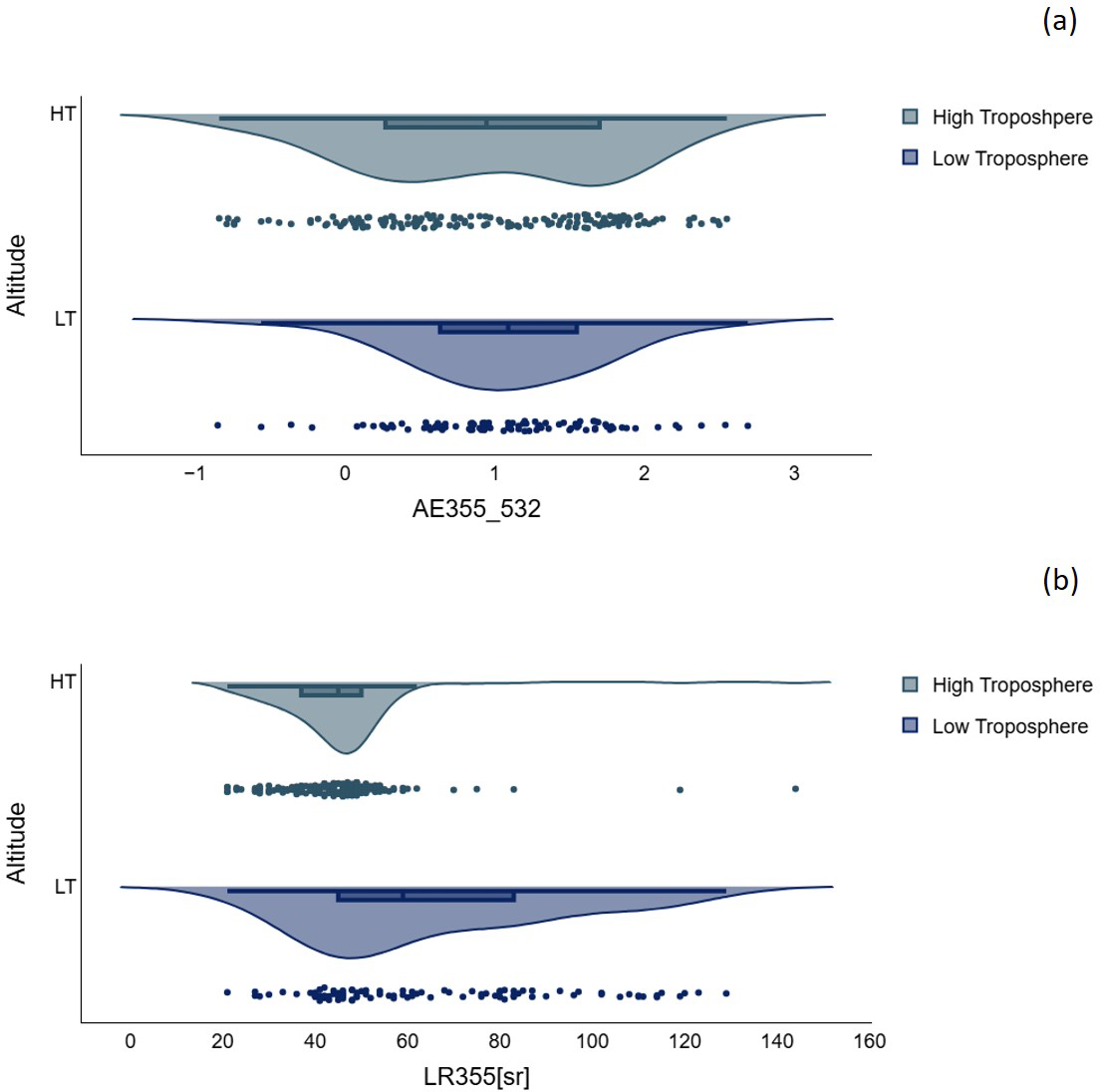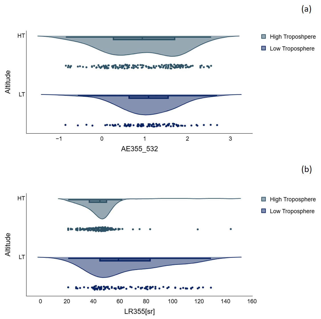 Figure 6 presents the distribution, central tendency, and spread of the aerosol extinction related Ångström coefficient at 355 to 532 nm (panel a), and of the lidar ratio at 355 nm (panel b), as they are characterizing low troposphere (LT) and High troposphere (HT).