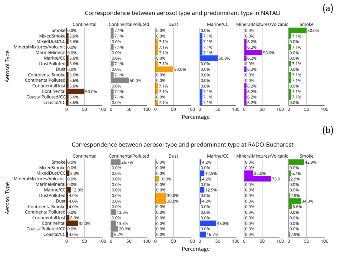 Figure 7Correspondence between the aerosol types retrieved in high resolution mode and the predominant aerosol type retrieved in low resolution mode: general correspondence in NATALI (a); correspondence as retrieved at RADO-Bucharest (b).