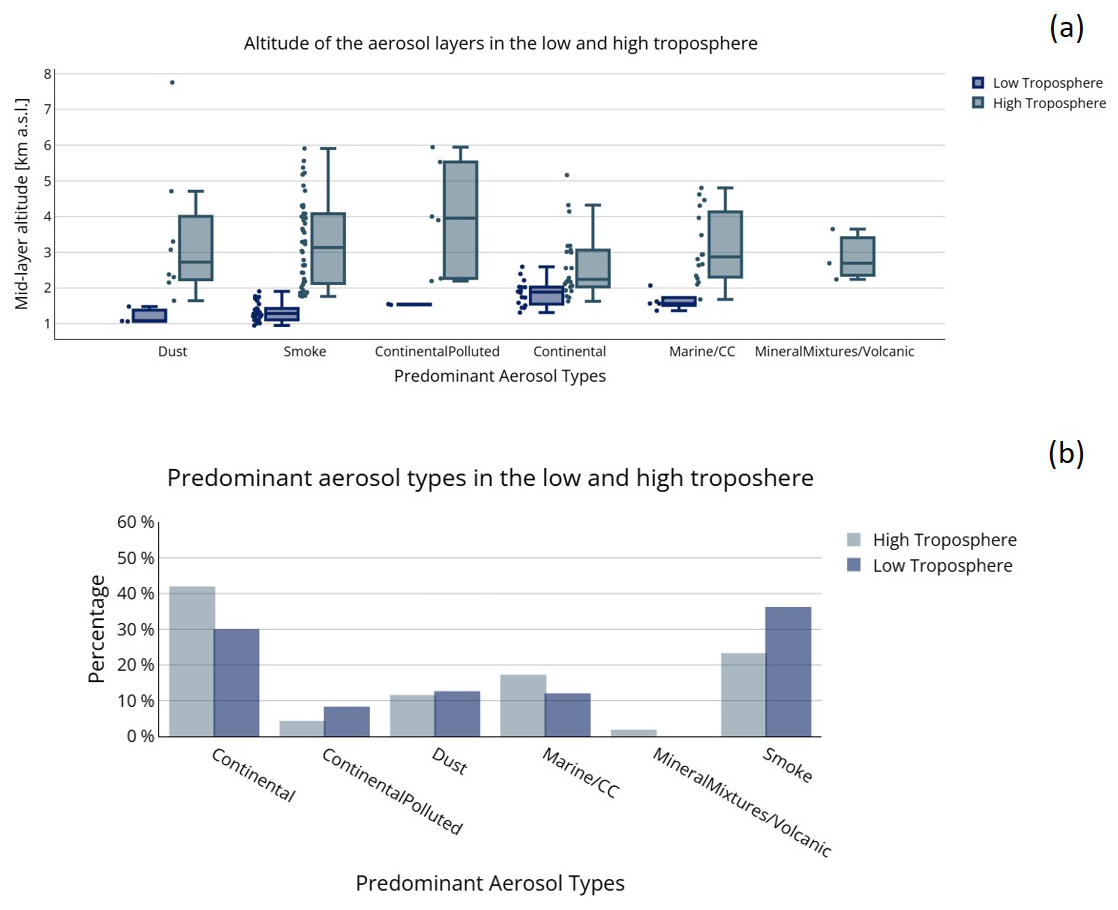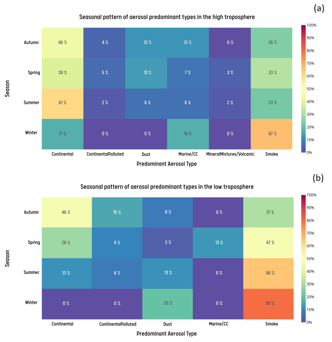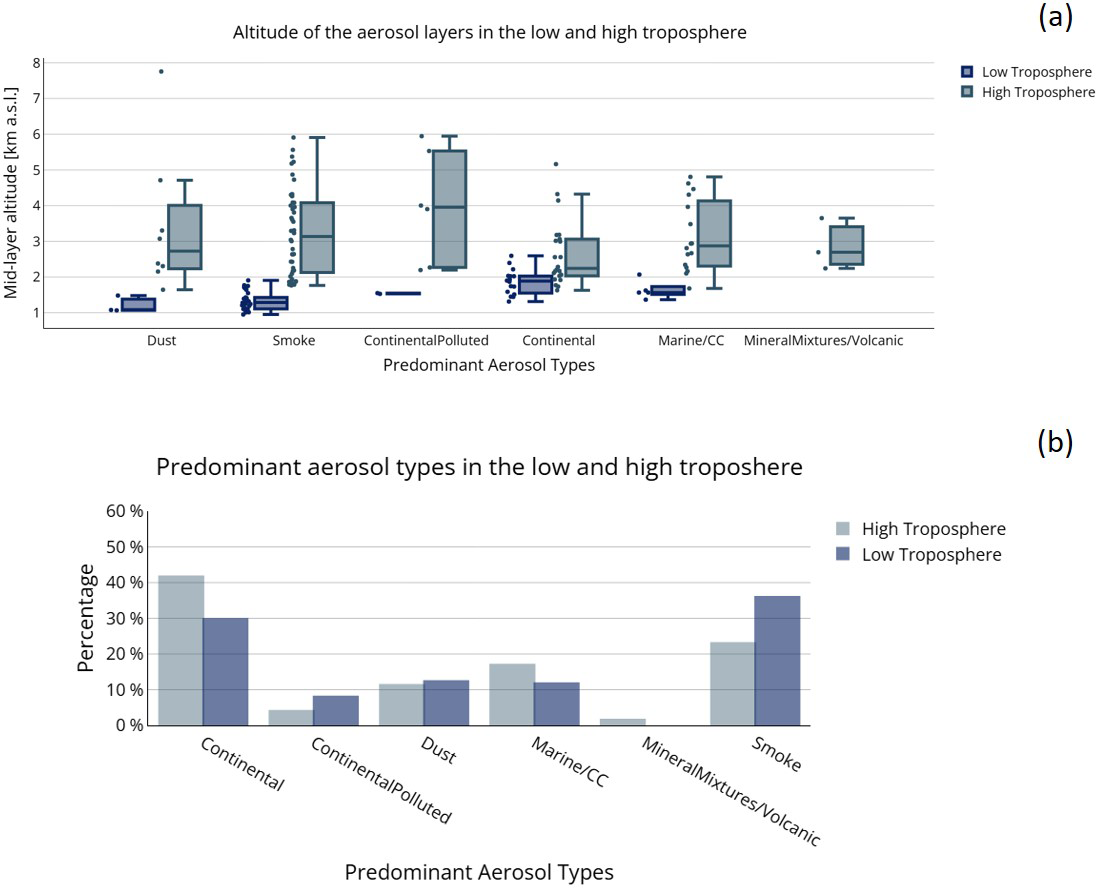 Figure 9 presents the distribution of the predominant aerosol types over seasons, in the low (bottom panel a) and high troposphere (panel b).