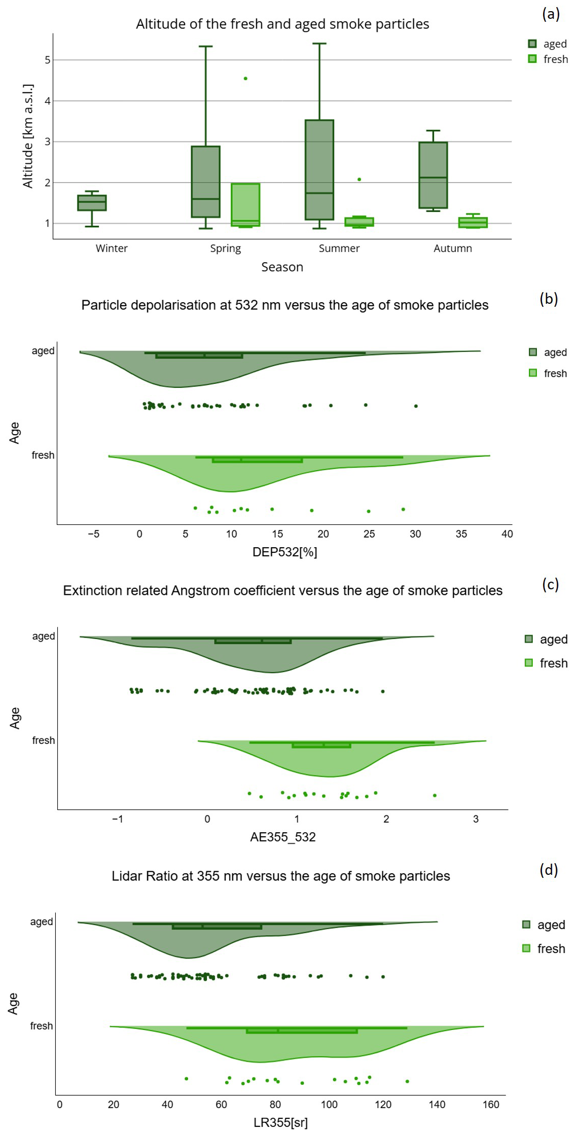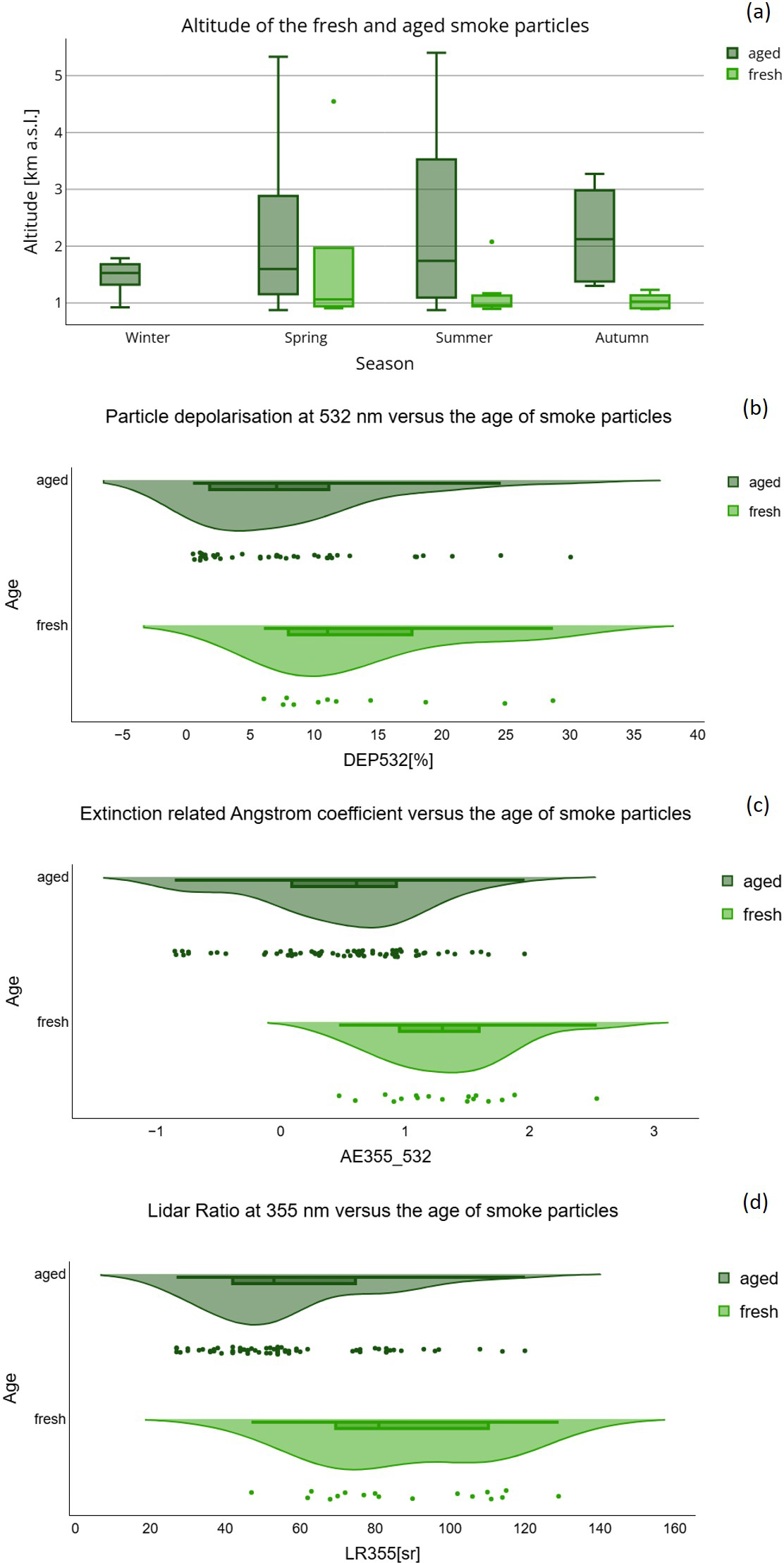 Figure 10Distribution, central tendency, and spread of the fresh and aged smoke characteristics: altitude of the smoke layers (a); linear particle depolarisation at 532 nm (b); extinction related Ångström coefficient (c); lidar ratio at 355 nm (d).