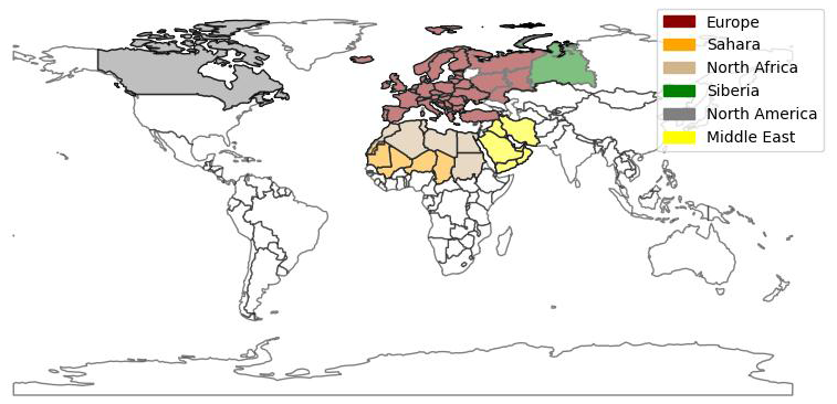 Europe in all seasons, and North Africa, North America and Siberia in summer, consistent with lidar-observed smoke layers (low depolarization ratio);