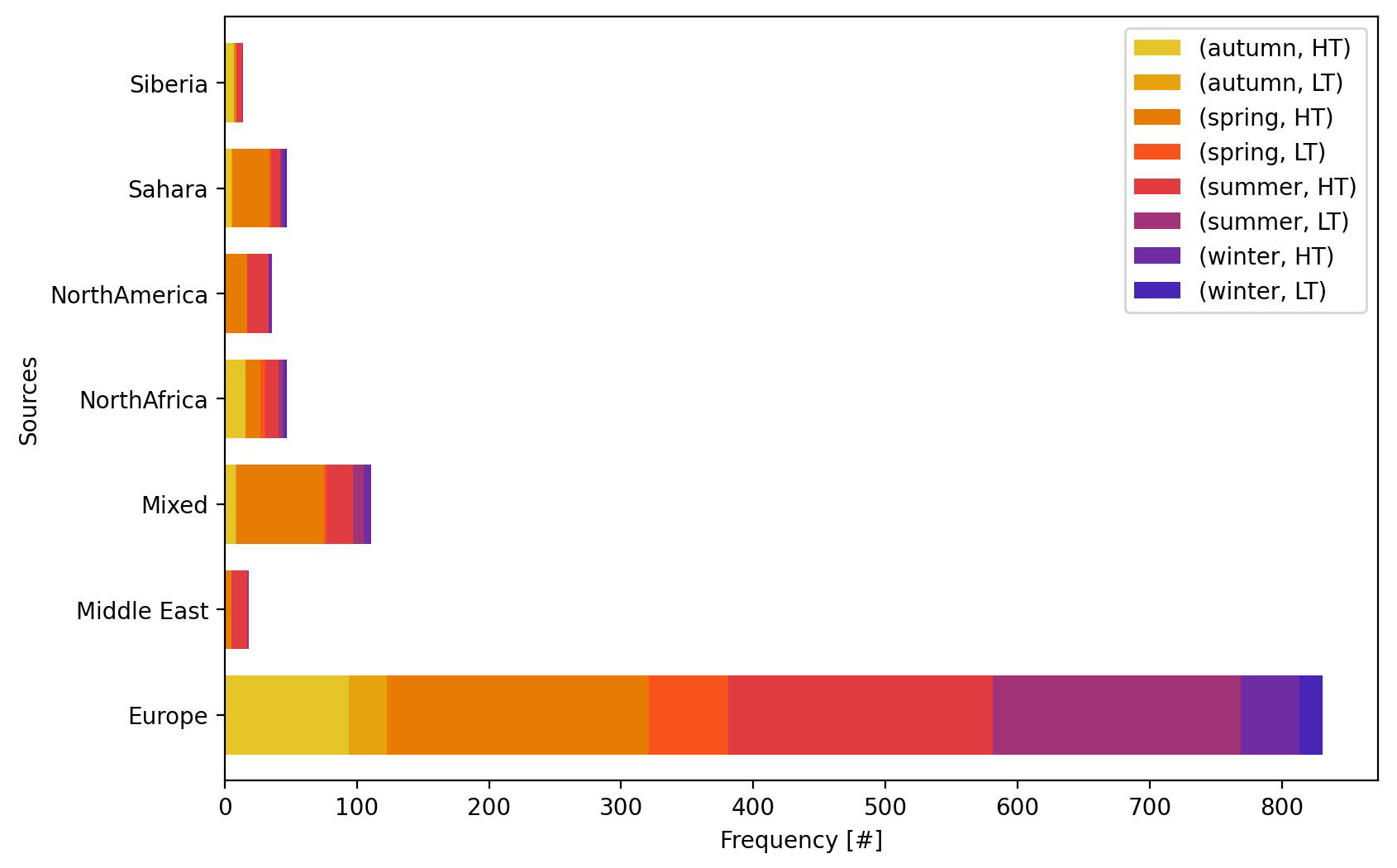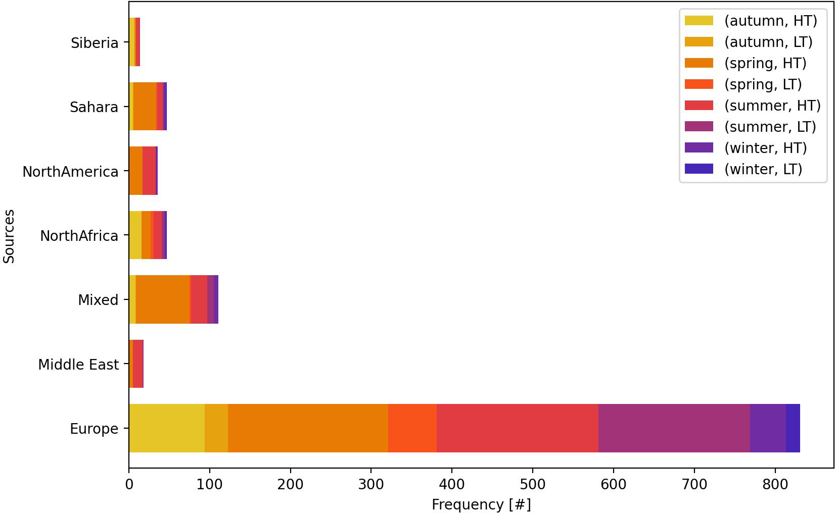 In the Supplement (S2) are presented in tabular form the distribution (in %) by season in the entire air column and in the two altitude classes (LT and HT) of the regions with sources associated with the types of aerosols observed in the lidar and photometer measurements for the analyzed period (Supplement S2, Tables S5–S7).