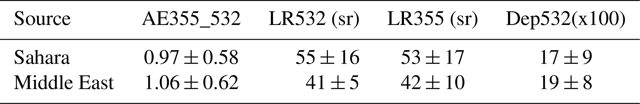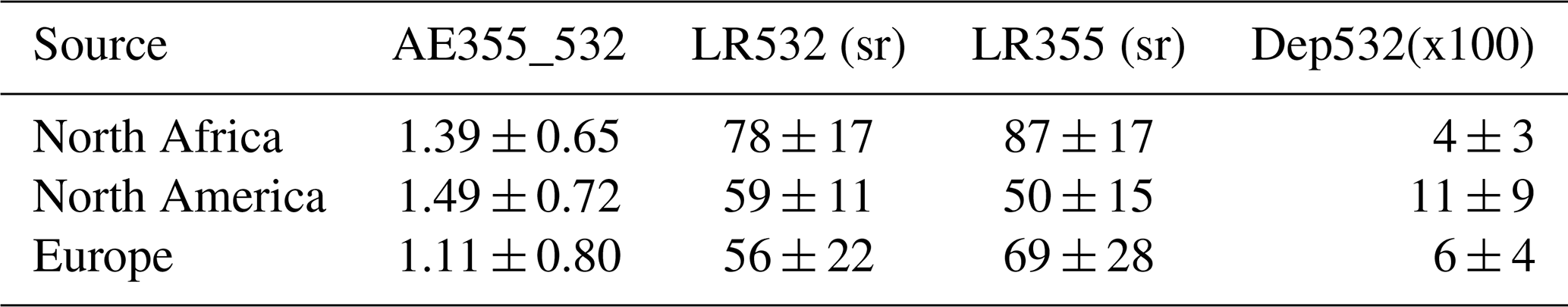 The mean values and standard deviation of the optical properties obtained from lidar data for dust originating from the Sahara, Europe and the Middle East are presented in Table 1 and for smoke originating from Europe, North Africa and North America are presented in Table 2.