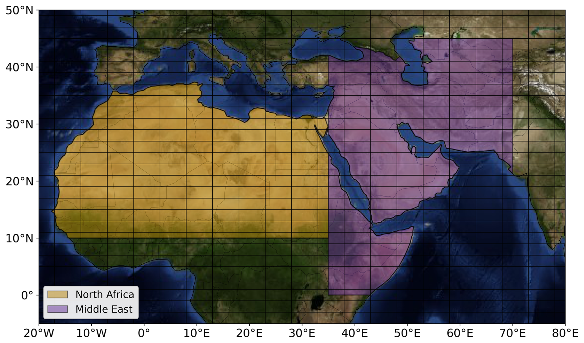Figure 1The North Africa (yellow-shaded area) and the Middle East (purple-shaded area) desert regions as defined based on Ginoux et al. (2012). The domain is divided into grids with 2° × 5° spatial resolution grids based on Winker et al. (2013) in order to minimize the signal error in CALIPSO mean profiles. Map source: NASA Earth Observatory.