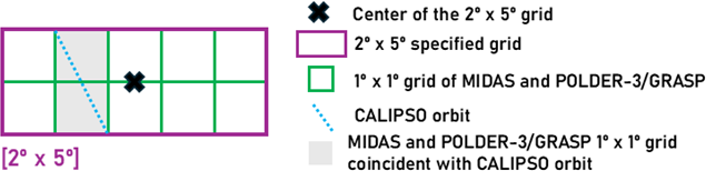 Figure 3Schematic representation of the spatial match-up methodology used to compare CALIPSO-derived aerosol properties, provided on a predefined 2° × 5° grid (outlined in purple), with the higher-resolution 1° × 1° grids of the MIDAS and POLDER-3/GRASP products (outlined in green). The black cross marks the center of the selected CALIPSO 2° × 5° grid cell. The blue dashed line represents the CALIPSO satellite orbit. MIDAS and POLDER-3/GRASP 1° × 1° grid cells that intersect the CALIPSO orbit are highlighted in light grey. Only the coincident 1° × 1° grid cells within the selected 2° × 5° region are considered for the match-up.