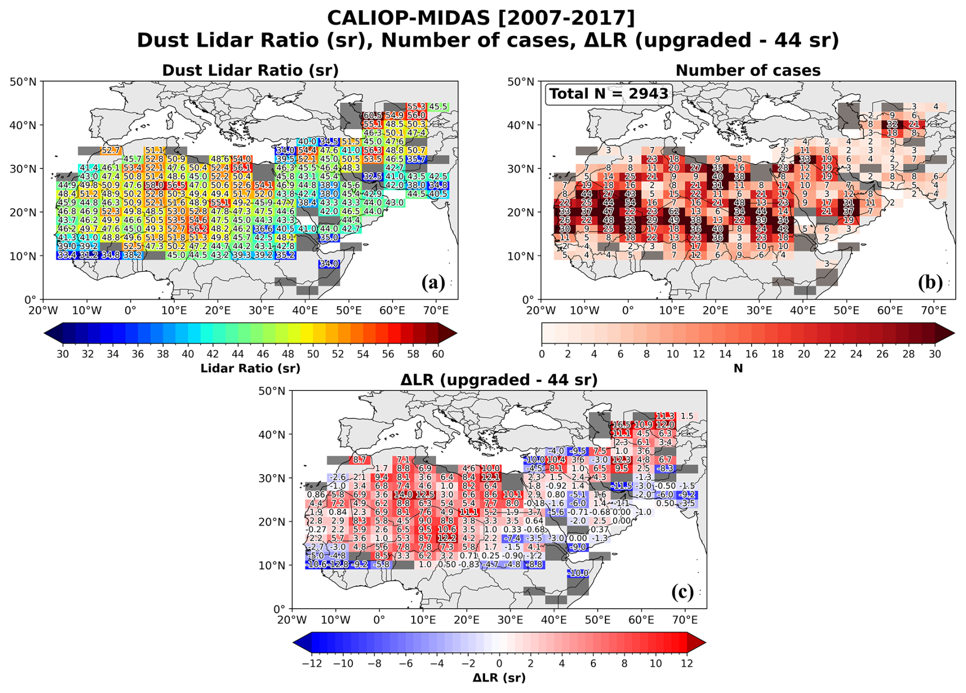 Figure 6Geographical distribution of (a) the mean dust Lidar Ratio (LR), (b) the number of dust cases (N), and (c) the departures of the updated dust LR from the default value of 44 sr used in the CALIPSO retrieval algorithm, all derived from the CALIOP–MIDAS synergy for the period 2007–2017. The values are computed at each 2° × 5° predefined grid. Grey-shaded grid cells indicate regions with only one available dust case, for which no robust LR estimate is provided.