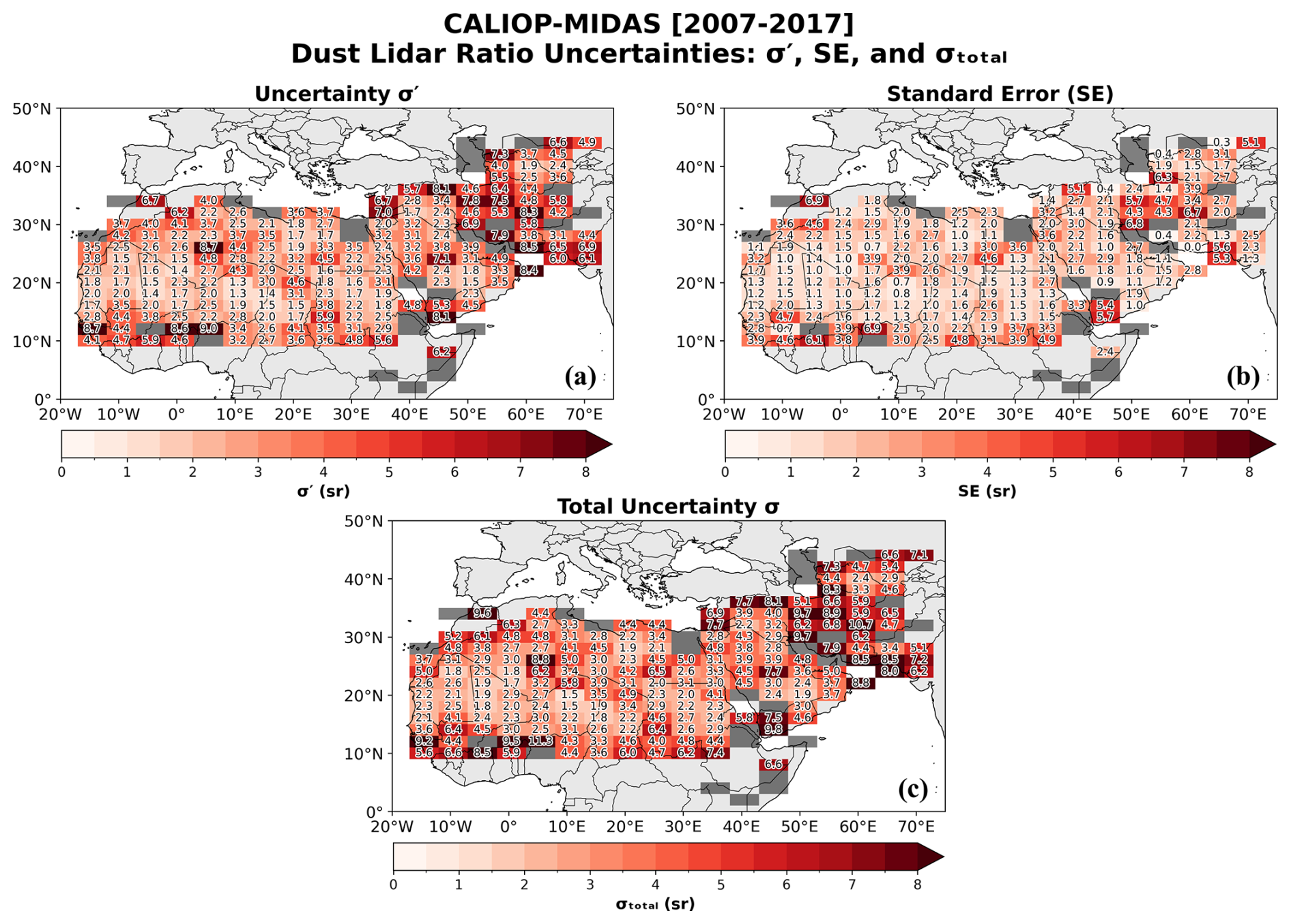 To quantify the uncertainty of the spatiotemporally averaged dust LR, we propagate the grid-cell-level uncertainties through the temporal and spatial averaging steps. Each grid cell may be sampled multiple times by different number of dust cases (selected based on the criteria discussed in Sect. 3.1), and the uncertainty of the mean dust LR therefore depends both on the uncertainties of the individual cases and on the sampling variability within the grid cell.