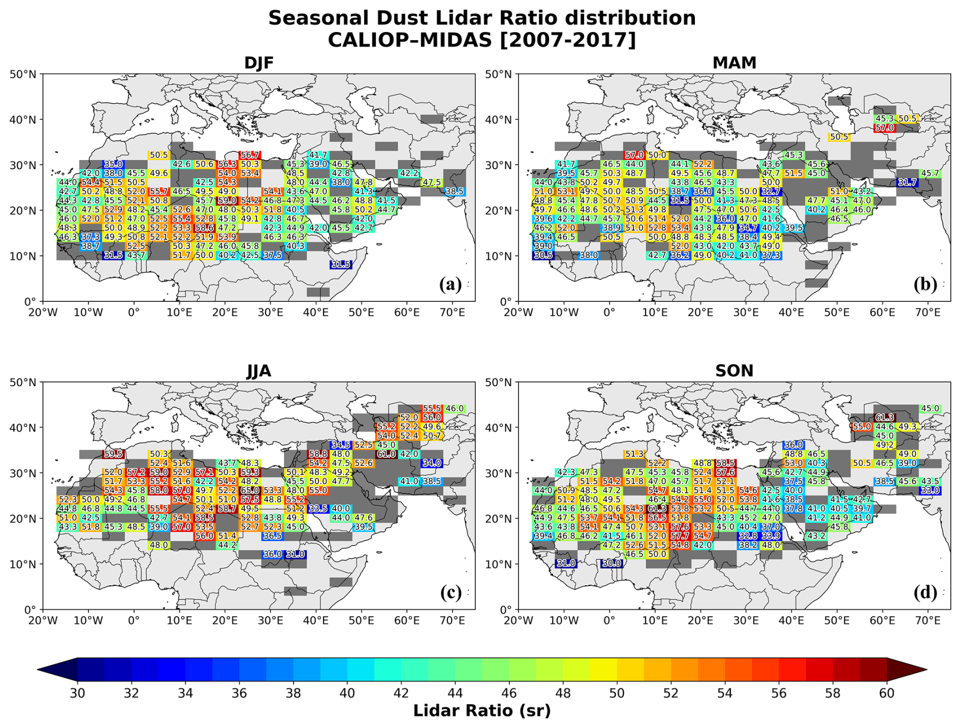 Following Eq. (9), a mean dust LR value a 532 nm was computed for each 2° × 5° grid over North Africa and Middle East domains (Fig. 1), along with its corresponding uncertainty metrics, and the number of the available dust cases. The LR geographical distribution of the differences between the upgraded dust LR (obtained via the CALIOP-POLDER-3/GRASP and CALIOP-MIDAS synergies, respectively) and the default value (44 sr) assigned to dust aerosols in the CALIPSO retrieval algorithm were also estimated. For the 10-year period of the CALIOP-MIDAS synergy, both annual and seasonal LR maps were produced. The corresponding dust LR maps and their uncertainties derived from the CALIOP–POLDER-3/GRASP synergy are also provided in the Supplement (Figs. S4–S5). However, due to the much shorter period of CALIPSO-PARASOL satellites coincidence (2006–2009) and the substantially smaller number of available dust cases (1116 instead of 2943 for CALIOP–MIDAS), these maps are not analysed in detail here. Their use is limited to the regional LR assessment in Sect. 5, where the number of coincident retrievals within each predefined region remains relatively sufficient to derive meaningful statistics.
