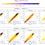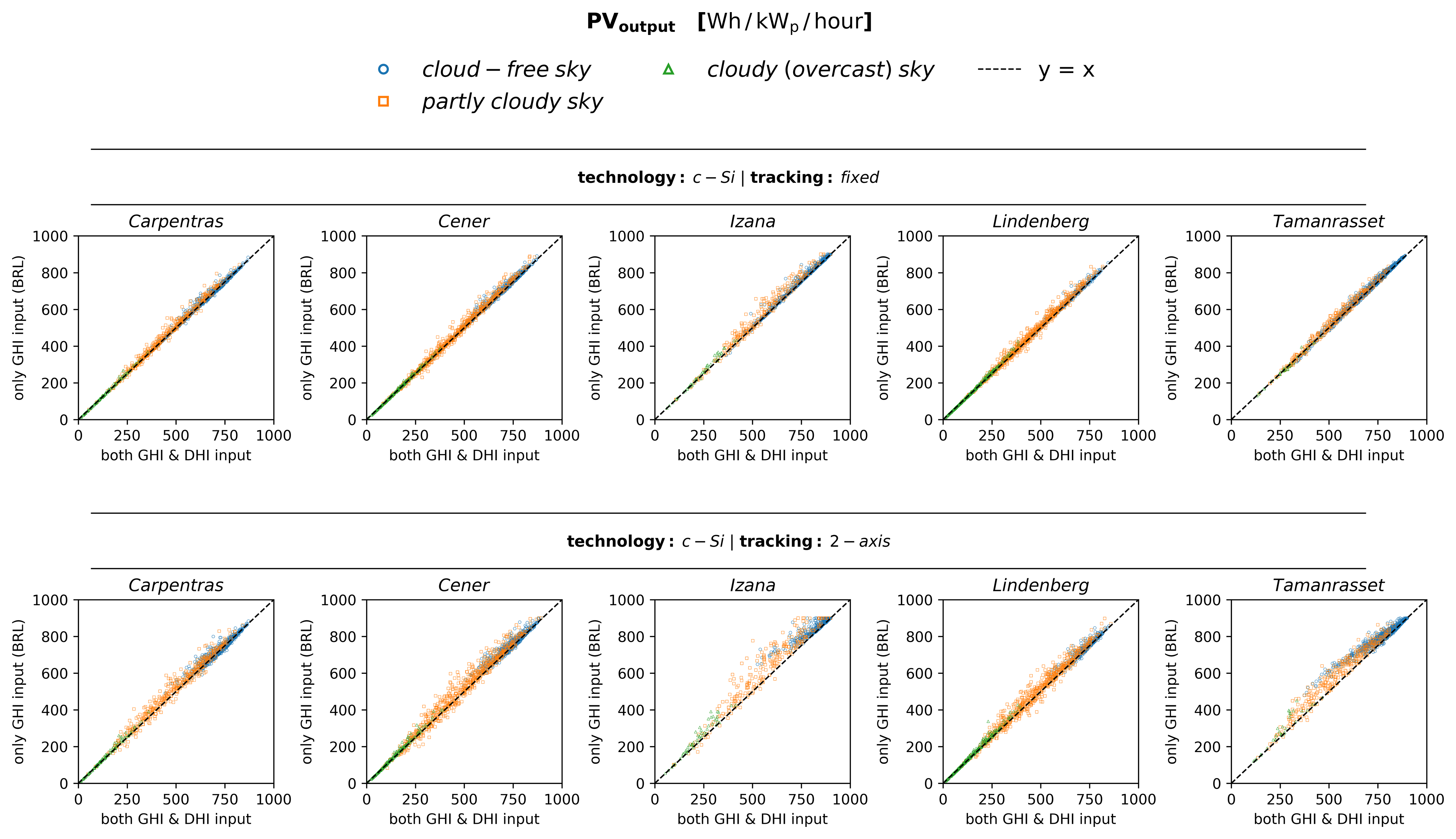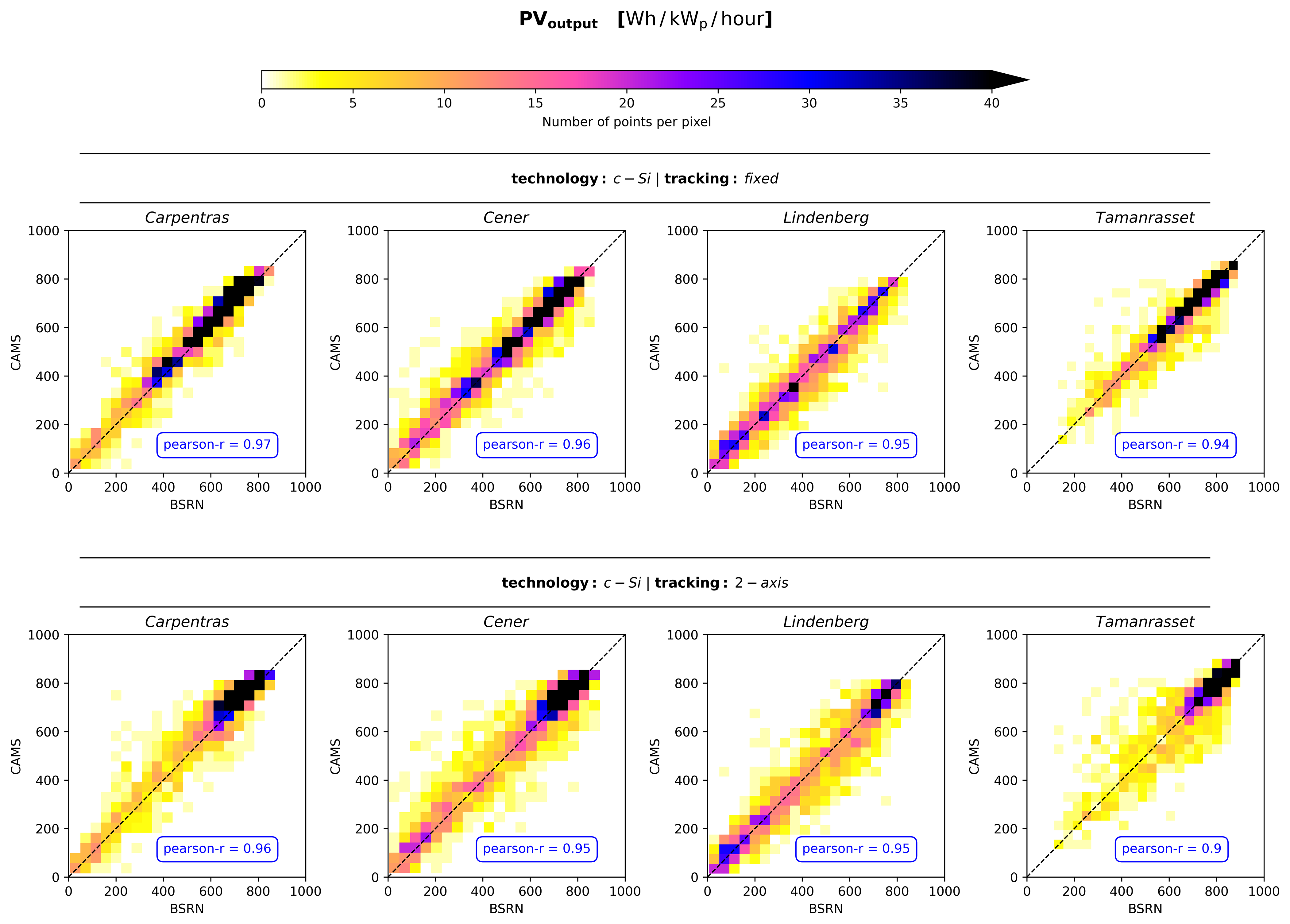 In Fig. 10 we provide density scatter plots comparing the CAMS-based PV output power with that computed from the ground-based BSRN data, aiming to illustrate how the uncertainty in the diffuse component estimates propagate to the calculation of power generation. Notably, there is a much greater dispersion from the y=x line in the case of simulating PV plants with 2-axis tracking system, compared to that within the modelling of fixed panels. This outcome is attributed to the increased sensitivity of the 2-axis tracking systems to the partitioning of global irradiance into its components. Nevertheless, correlation coefficients are in all cases better than 0.9.