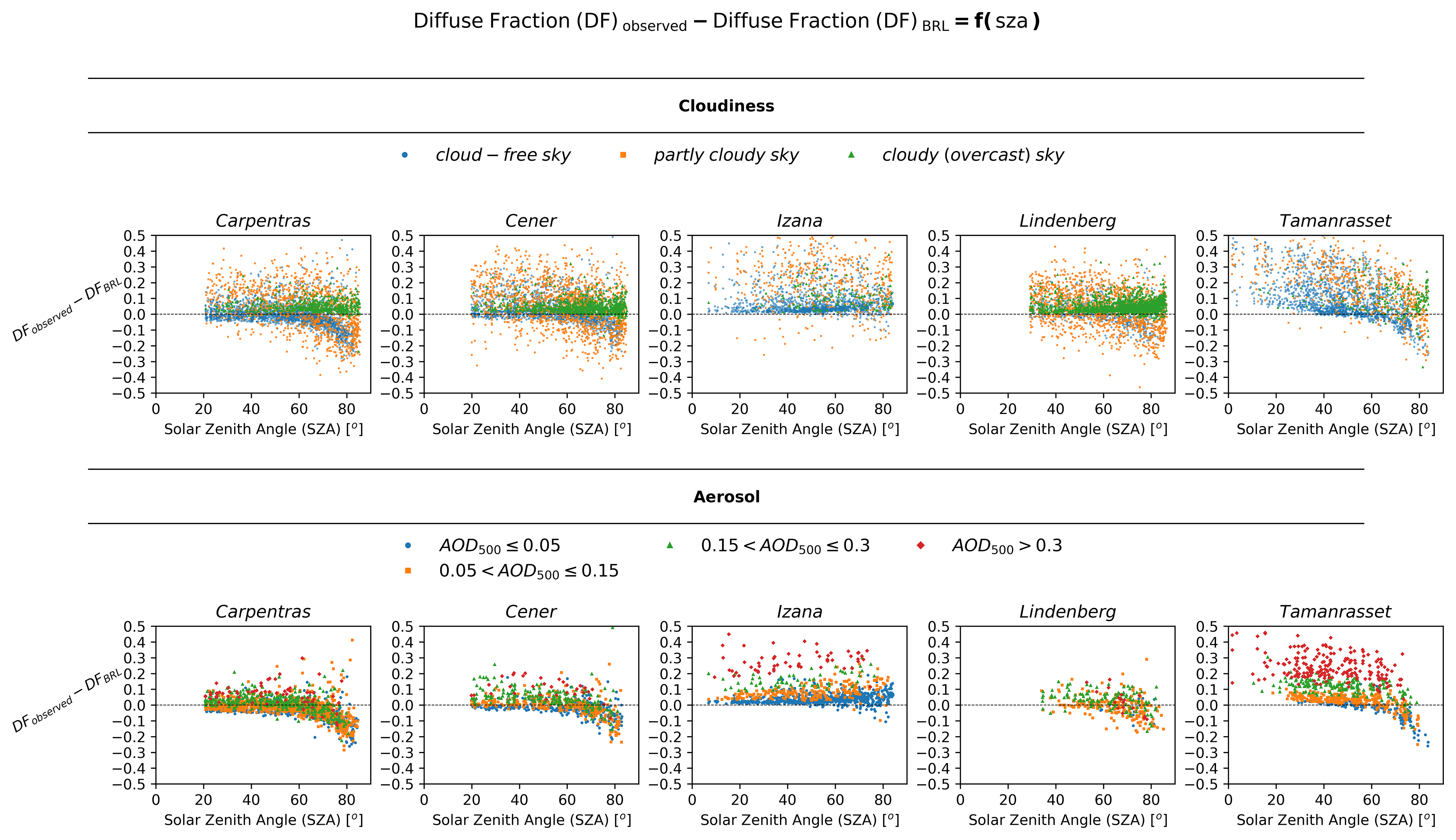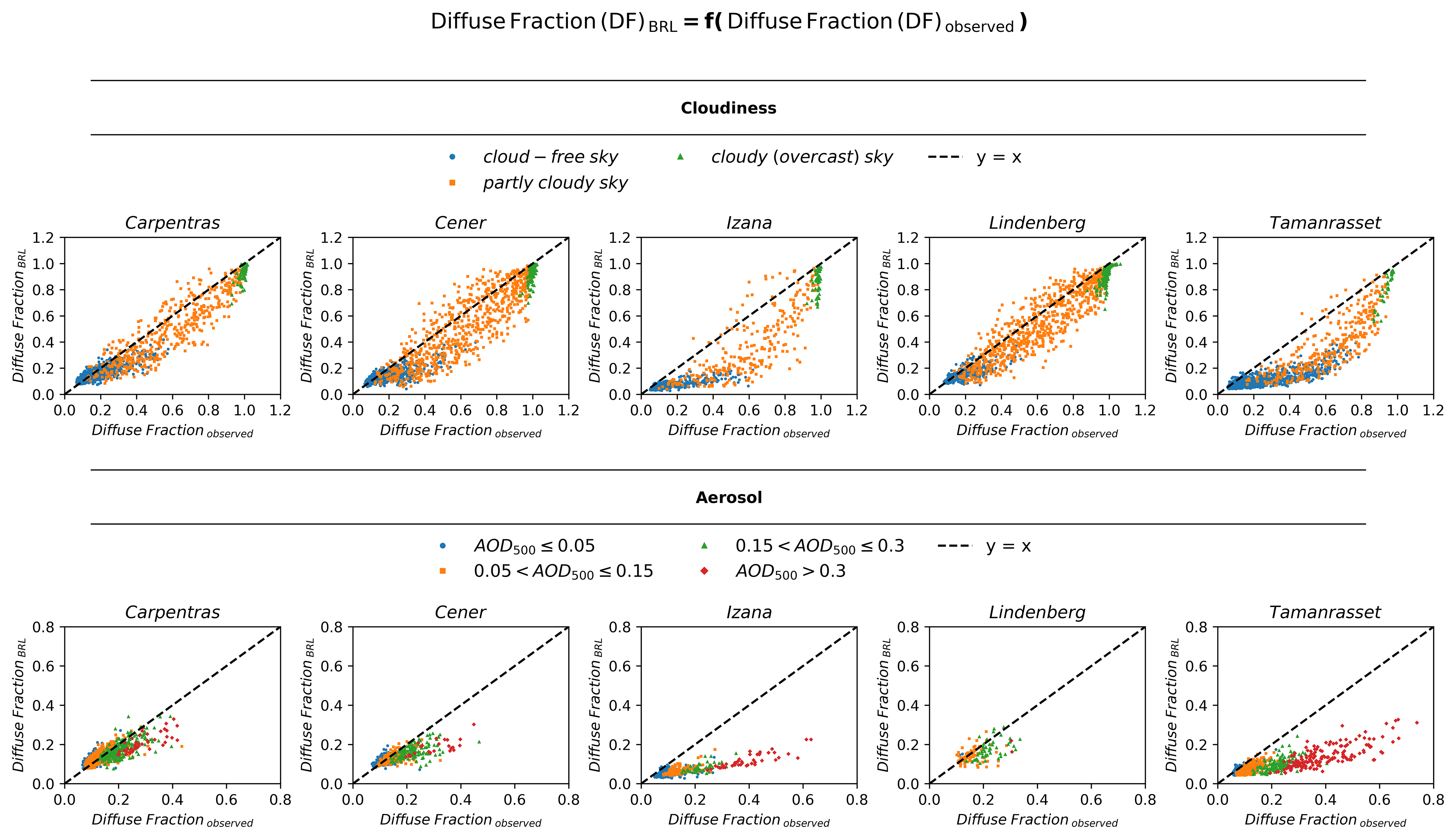 The performance of BRL was evaluated by comparing the actual diffuse fraction, obtained directly from resampled to hourly BSRN ground-based measurements, with that derived using BRL. As a first step, to isolate the influence of SZA from that associated with the atmospheric conditions, the difference in diffuse fraction (DF) between the observed and the one estimated using BRL as a function of SZA is presented in Fig. 2. The atmospheric conditions are represented separately for both all-sky and cloud-free sky conditions and are grouped into clusters, as outlined in Sect. 2.2. The patterns reflecting the differences under the distinct sky conditions indicate an additional dependency on SZA, which becomes apparent approximately at SZA between 60 and 70°. In most cases, there is an almost constant displacement with respect to y=0 below 60°, as well as a change in behavior when SZA exceeds this value. Izaña presents a special case, as the station is located at a very high altitude. At such high altitudes the contribution of the diffuse component to the total irradiance is significantly smaller relative to lower altitude sites, which seems to be captured more accurately by BRL at high SZAs. We must also note that (i) at Izaña, the actual diffuse irradiance may experience an additional enhancement due to the contribution of adjacent lower-lying clouds – an effect that is not accounted for in the diffuse fraction model, and (ii) during dust events the site is usually inside – and not under – the dust layer, which results in more complex interactions between dust and solar radiation relative to lower altitude sites. Defining an exact limit (for the lower altitude sites), where the behavior is changing, is challenging; therefore, 60° was selected for practical energy-related applications, focusing on periods with meaningful energy contribution, and is supported by the sensitivity analysis (Sect. 3.2) under clear-sky conditions. Concerning the same grouped atmospheric conditions, Fig. 3 illustrates the comparison between the observed and the estimated diffuse fraction for SZA≤60°. This approach allows us to examine BRL performance after eliminating the influence of SZA, thereby providing a more comprehensive view of its reliability.