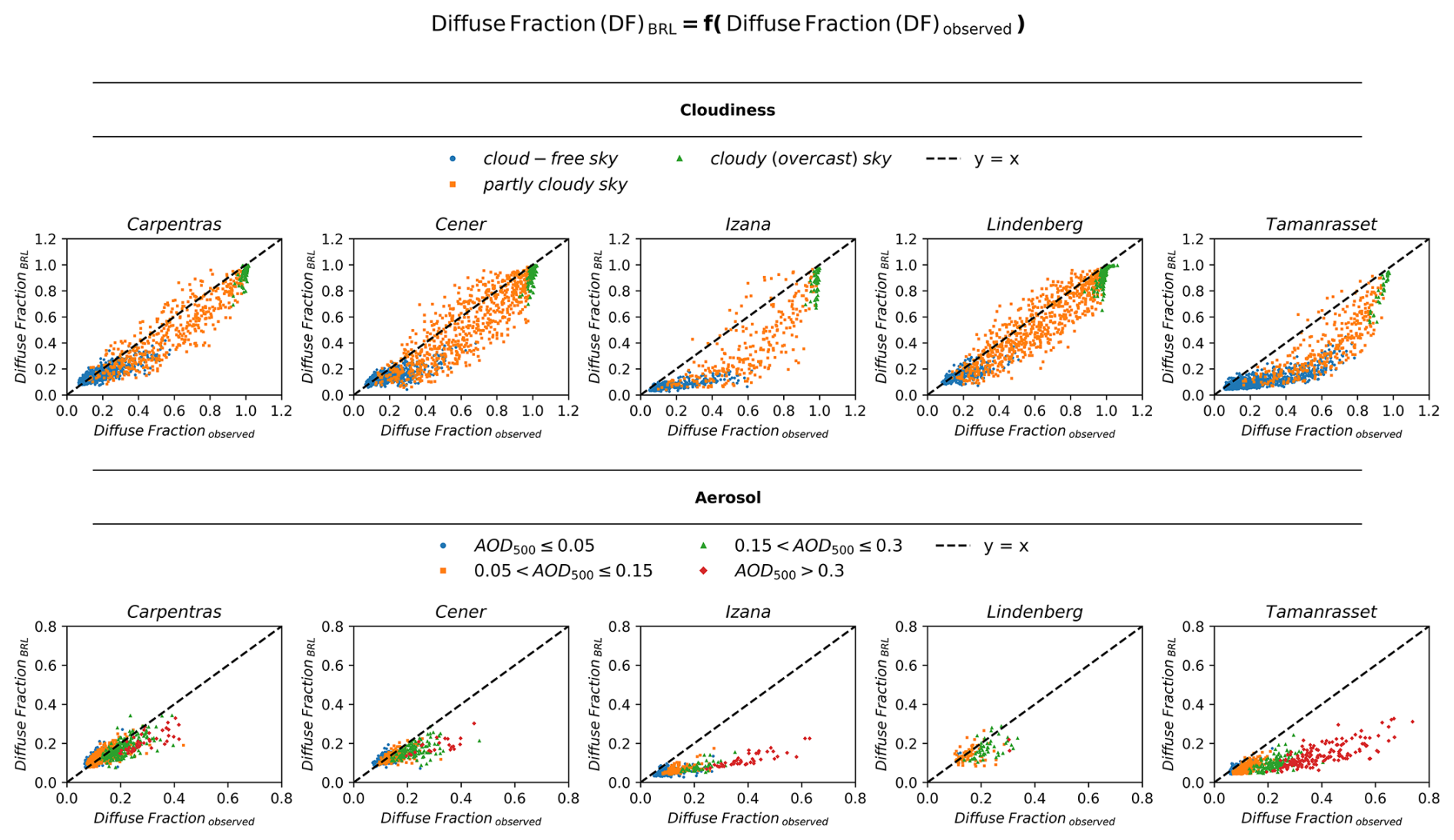 From Fig. 3, a distinct dependency of BRL's reliability on the atmospheric conditions can be observed. Under all-sky conditions, the presence of clouds has a notable impact on the model's performance. Partly cloudy conditions result in greater dispersion of the values from the identity line respectively, likely due to the complexity of such sky scenes. Under overcast conditions, where the sky can be considered homogeneous and isotropic, the model in most cases performs slightly better. However, the limitations of the DNI-based classification methodology, related to the complexity of the cloud scenes, the spatiotemporal variability during the hourly periods, and the 3D variability of cloud properties, would require additional observational tools for a more detailed investigation. More specifically, the vast majority of overcast cases where the BRL diffuse fraction is below 0.8 while the observed is close to 1 correspond to periods involving rapid transitions between partly cloudy and overcast skies, occurring either during the hour itself or immediately before or after it. Furthermore, a limited number of cases identified during intense dust events at Tamanrasset and Izana, where the reduction of DNI was so pronounced that the applied DNI-based criterion classified these conditions as overcast. However, these cases are not further investigated, as the energy production levels during such periods are very low.