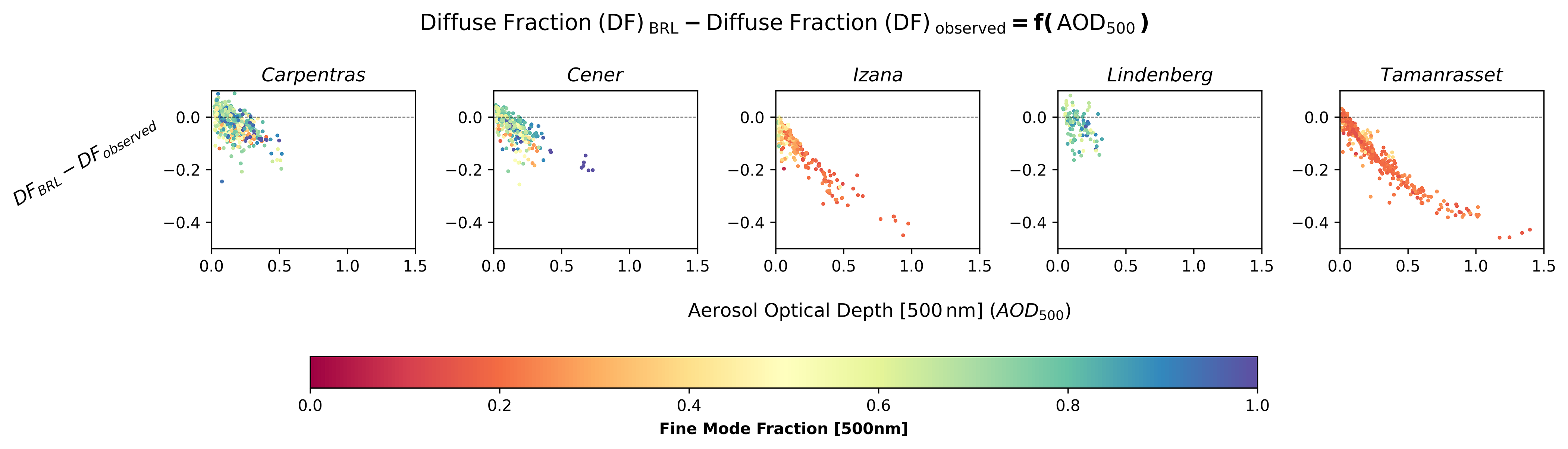 Under cloud-free skies, BRL tends to underestimate, and this bias becomes more pronounced as aerosol load increases. Aiming to highlight this dependency, Fig. 4 shows the difference between the estimated and the observed diffuse fraction as function of AOD500, emphasizing also the extent to which it is related to the aerosol type by providing FMF500. A decrease for increasing AOD500 is evident across all cases. In Tamanrasset and Izaña, associated with the influence of Saharan dust, the coarse mode dominates, and a more distinct and well-defined curve is depicted compared to other sites.