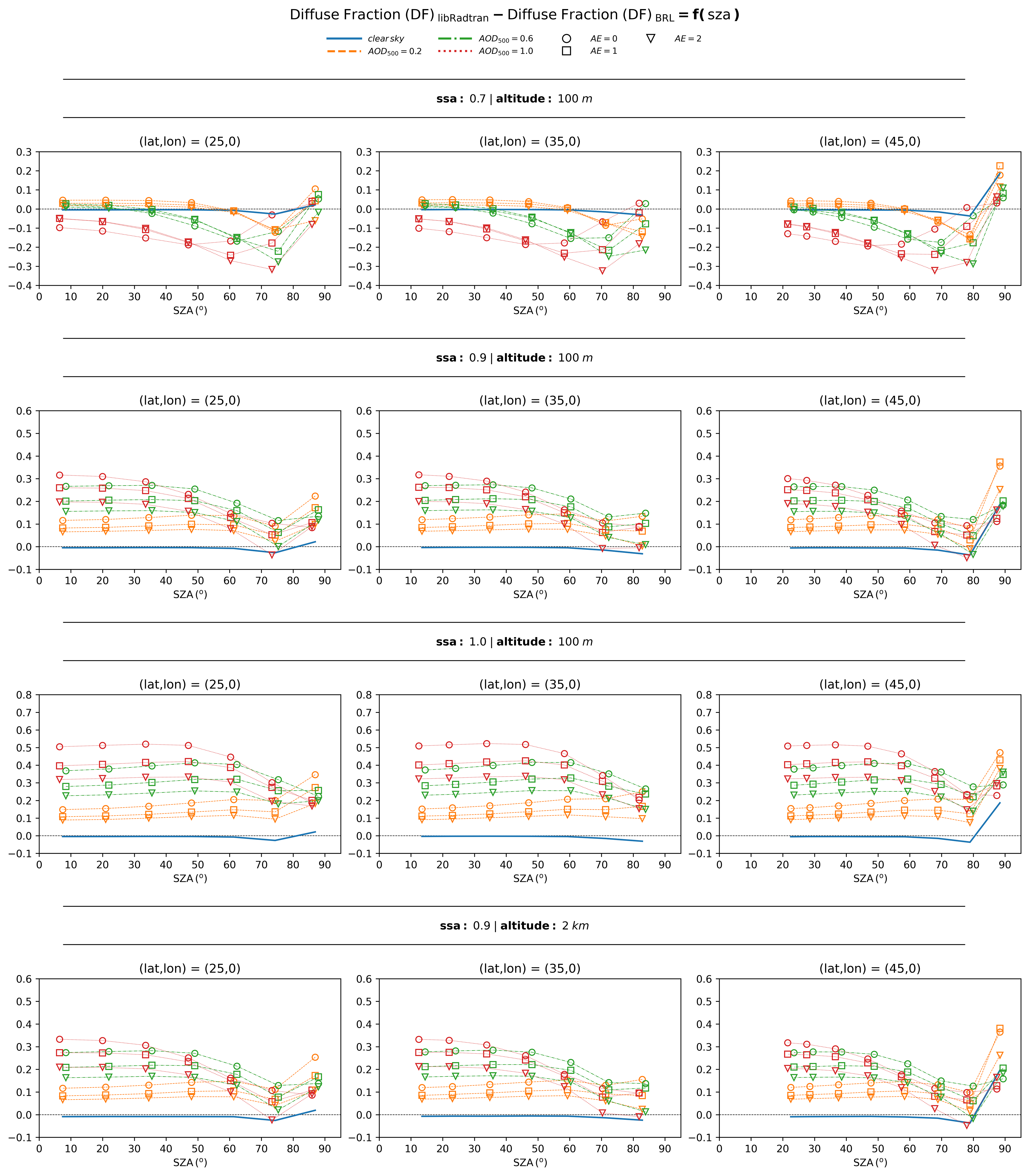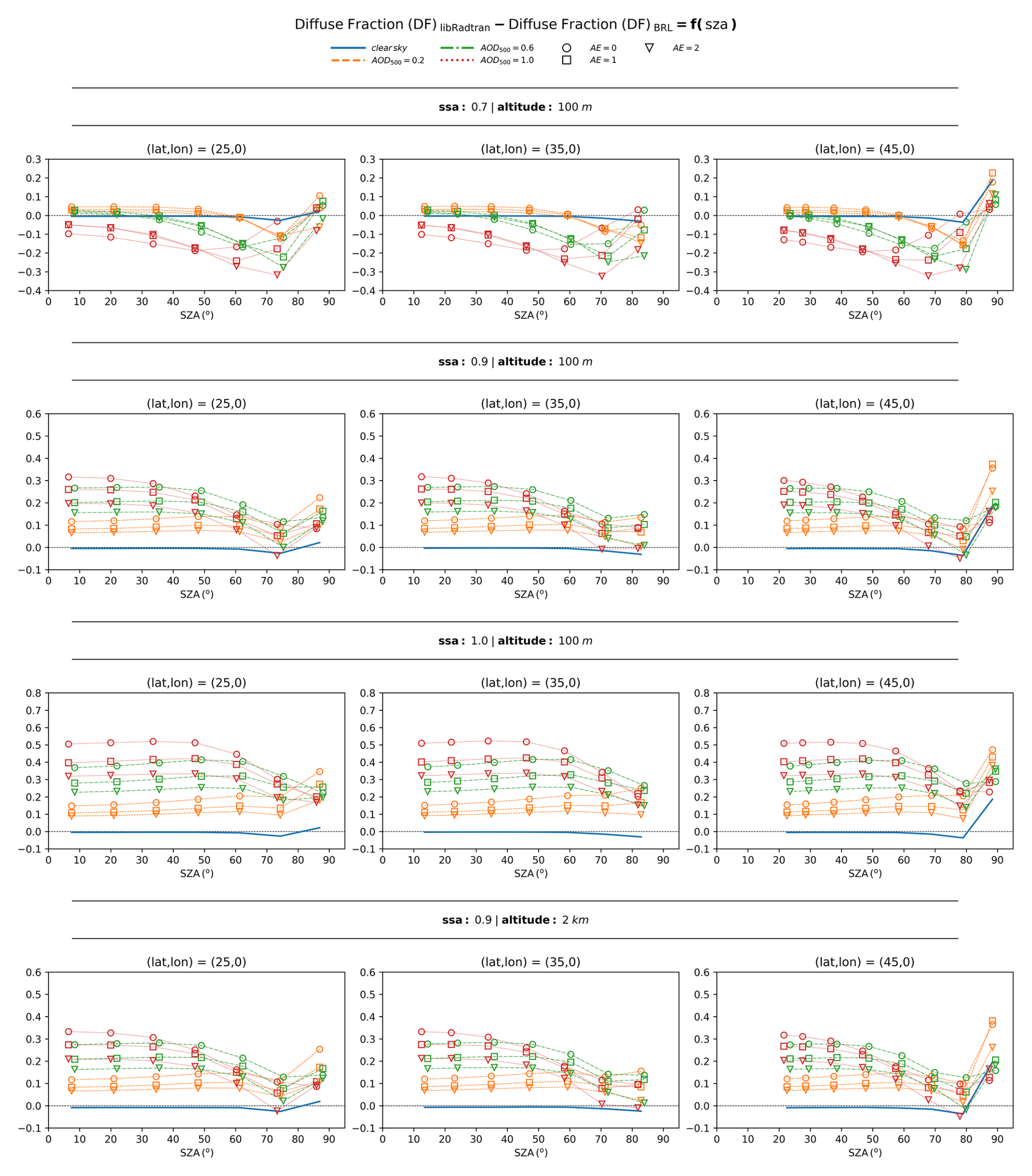 We performed Radiative Transfer (RT) simulations aiming to further assess the uncertainties in estimating the diffuse fraction arising from the effect of aerosols. The simulations were conducted using libRadtran (Emde et al., 2016; Mayer and Kylling, 2005), a widely used software package, allowing the computation of radiances, irradiances, and actinic fluxes. A sensitivity analysis was performed by comparing the diffuse irradiance calculated from libRadtran with the estimations of BRL. This analysis examines the dependence of the aerosol-related discrepancy as function of Solar Zenith Angle (SZA) and latitude, considering the effect of parameters such as surface albedo and altitude.