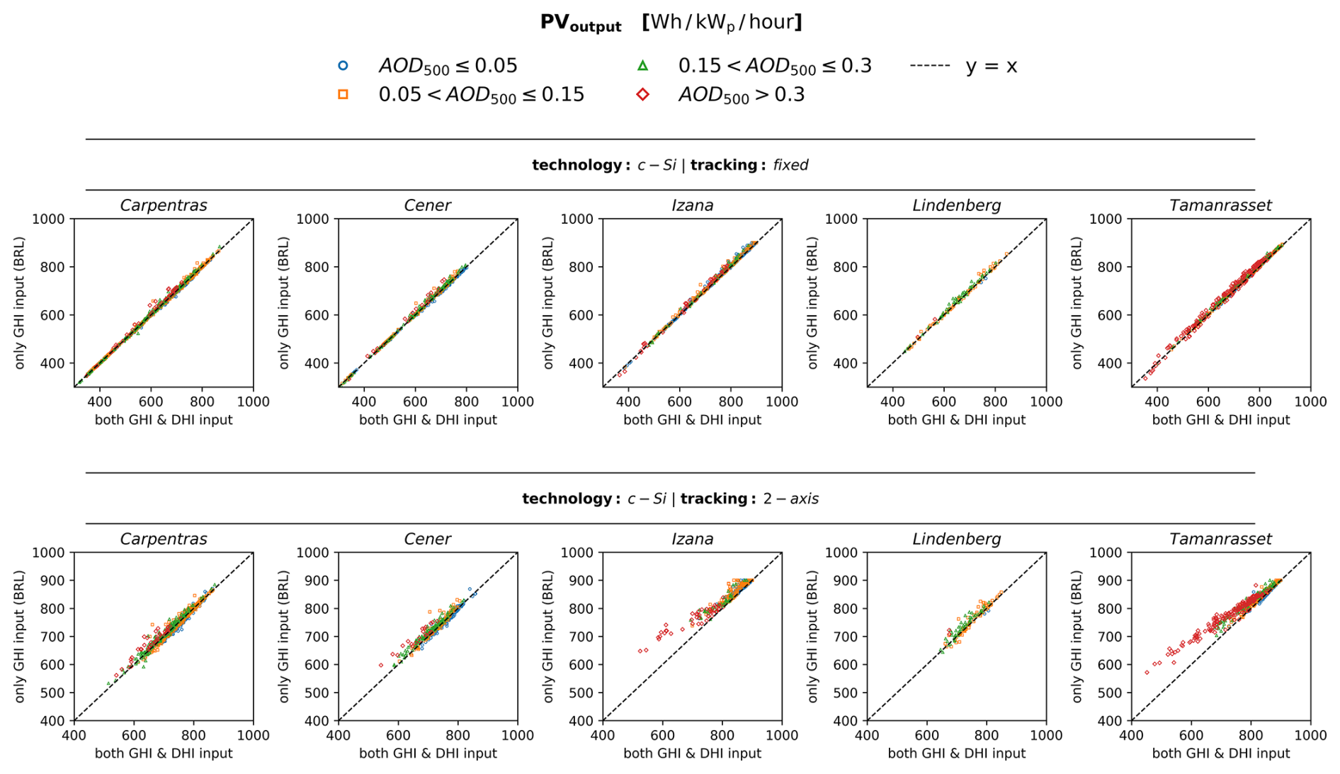 Figure 7Comparison of the estimated hourly PV power generation between simulations performed using GSEE with input data consisting of either only GHI or both GHI and DHI under varying aerosol conditions: (top) fixed panels (bottom) 2-axis tracking systems.