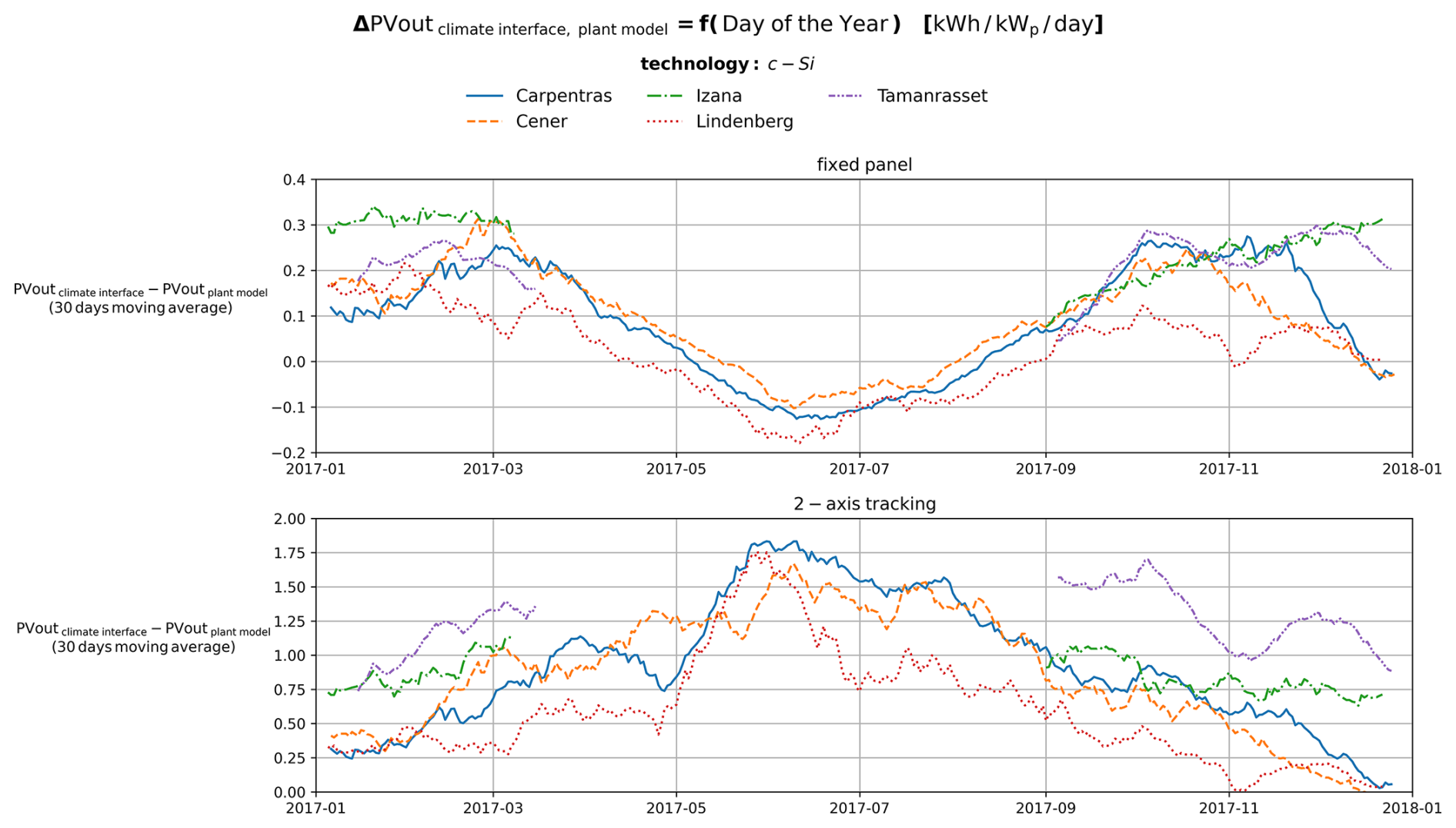 The Climate Interface generates the hourly profile of GHI for each day as a sinusoidal function. Then, the BRL is applied to the hourly time-series, and the hourly power generation is computed. Finally, these values are summed up to provide an estimate of the total daily output power. As shown in Fig. 8, which illustrates the differences between the Climate Interface estimates and the sums of the hourly simulations, this approach introduces a variability throughout the year. Furthermore, Figure S6 in the supplement presents the percentage differences between the two approaches, using the latter as the reference.