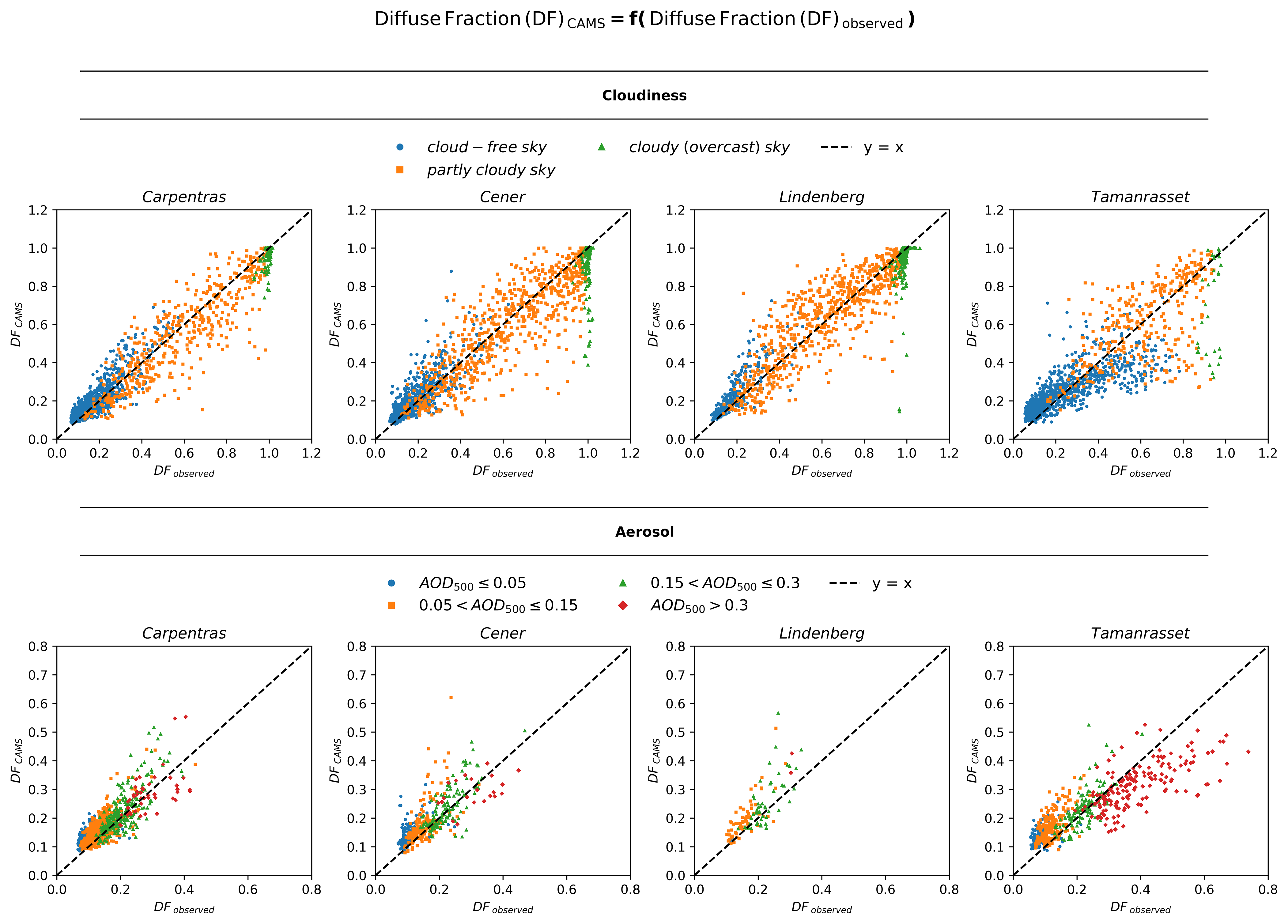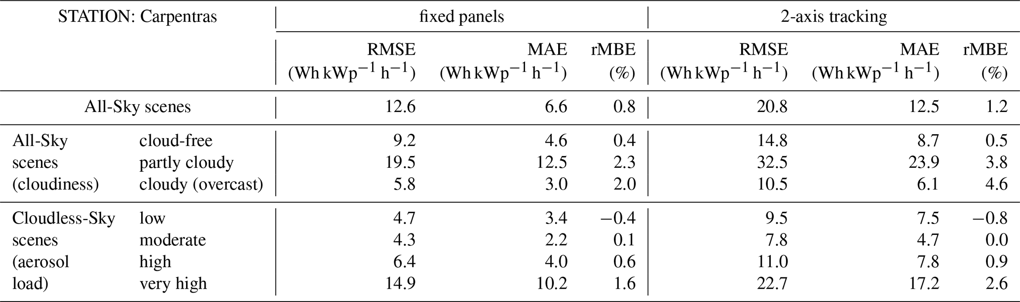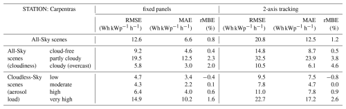 Additional evaluation metrics are provided in the supplement (Tables S9–S12). Indicatively, we observe that under cloudless conditions, for fixed panels, RMSE ranges between 25.0 to 42.3 Wh kWp−1 h−1 in Carpentras and 16.6 and 31.0 Wh kWp−1 h−1 in Tamanrasset, with variations linked to aerosol loading. Similarly, MAE ranges from 20.0 to 36.9 Wh kWp−1 h−1 in Carpentras and 11.9 to 22.9 Wh kWp−1 h−1 in Tamanrasset. For 2-axis systems, RMSE and MAE follow similar trend, ranging from 28.8 to 49.9 Wh kWp−1 h−1 and 22.3 to 44.1 Wh kWp−1 h−1, respectively, in Carpentras, and from 20.8 to 48.0 Wh kWp−1 h−1 and 15.3 to 35.5 Wh kWp−1 h−1, respectively, in Tamanrasset. Conversely, under cloudy conditions the errors are significantly increasing. In Carpentras, as well as in Cener, and Lindenberg (according to the corresponding tables in the supplement) the errors peak under partly cloudy conditions, with RMSE reaching up to 94.2 Wh kWp−1 h−1 in Carpentras. However, in Tamanrasset, the highest errors occur under overcast conditions, where RMSE and MAE for 2-axis solar tracking systems reach 210.7 and 151.6 Wh kWp−1 h−1, respectively. This exception can be interpreted through Fig. 15, which illustrates that in the rare overcast scenes in Tamanrasset, CAMS occasionally reports low diffuse fraction values instead of values close to 1, suggesting that CAMS did not accurately represent cloudiness in these cases.